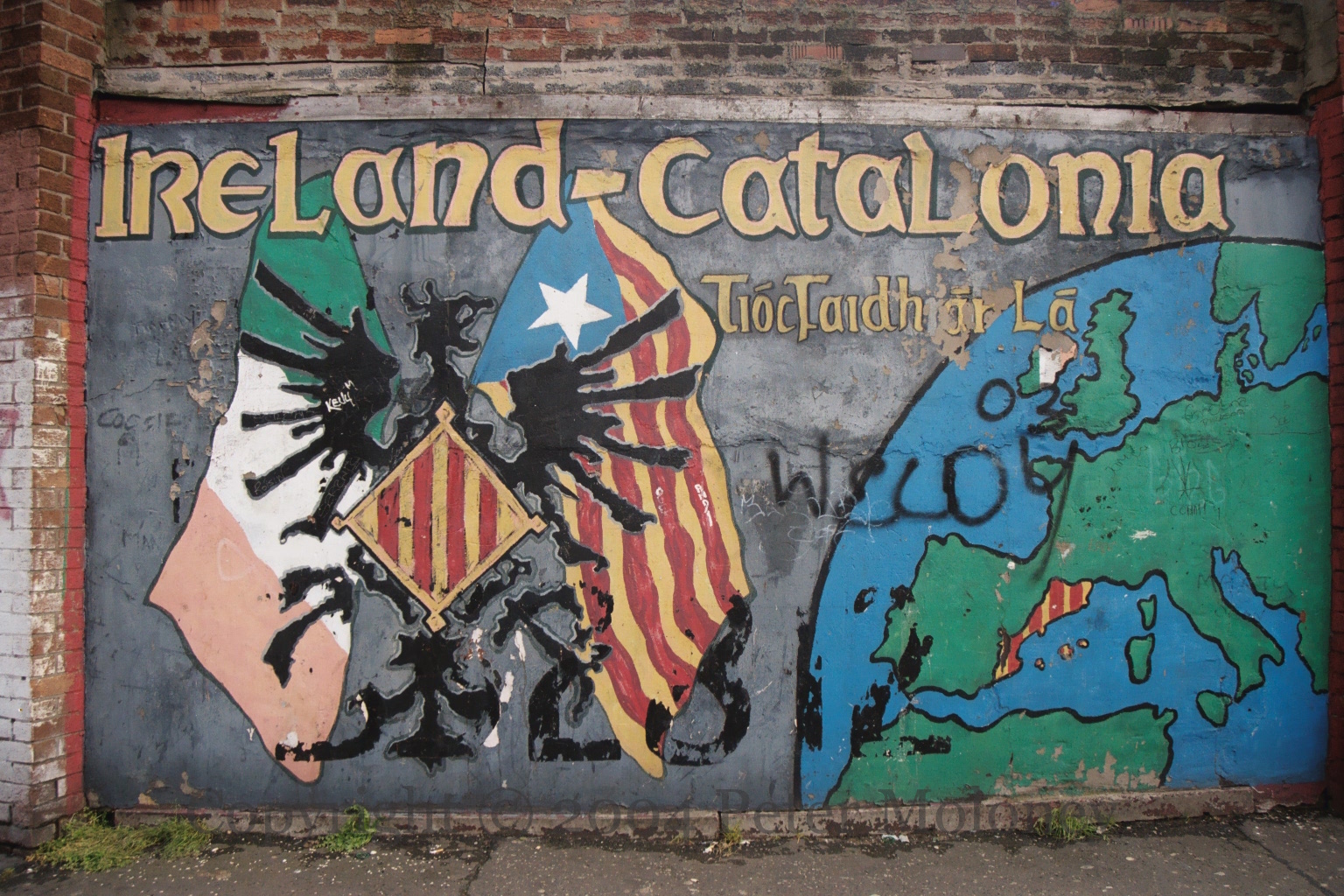Seven years after it was originally painted in 1997, the pro-Catalan mural in Beechmount Avenue is showing its age. “Not Spain, not France. Free Catalonia. Since 1714 the Catalan nation is military [sic] occupied for the Spanish and French states. Catalonia has their own culture, language, and history. Our country have [sic] more than 1000 years of history as a nation. The Catalan flag is the first European flag. Our fight flag is the “Estalada”. The white star means the freedom, and the blue triangle stands for the sky of humanity. Free Catalonia! United Ireland! El nostre dia arribarà! Tıócfaıdh [sic] ár lá. 11/8/97”