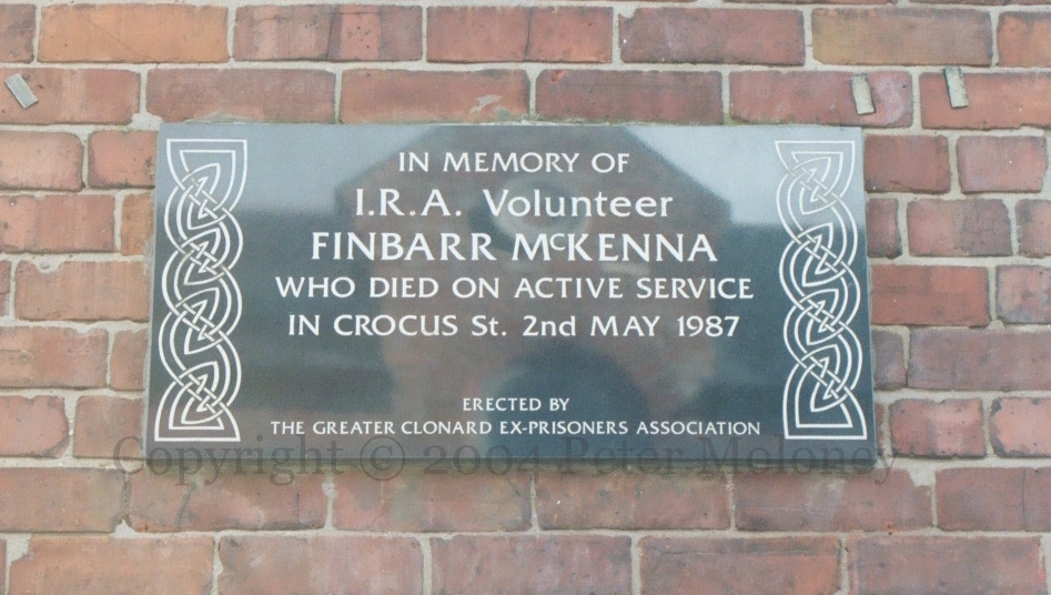 “In memory of IRA Volunteer Finbarr McKenna who died on active service in Crocus St. 2nd May 1987. Erected by the Greater Clonard Ex-Prisoners Association.” McKenna was killed by a bomb going off prematurely.