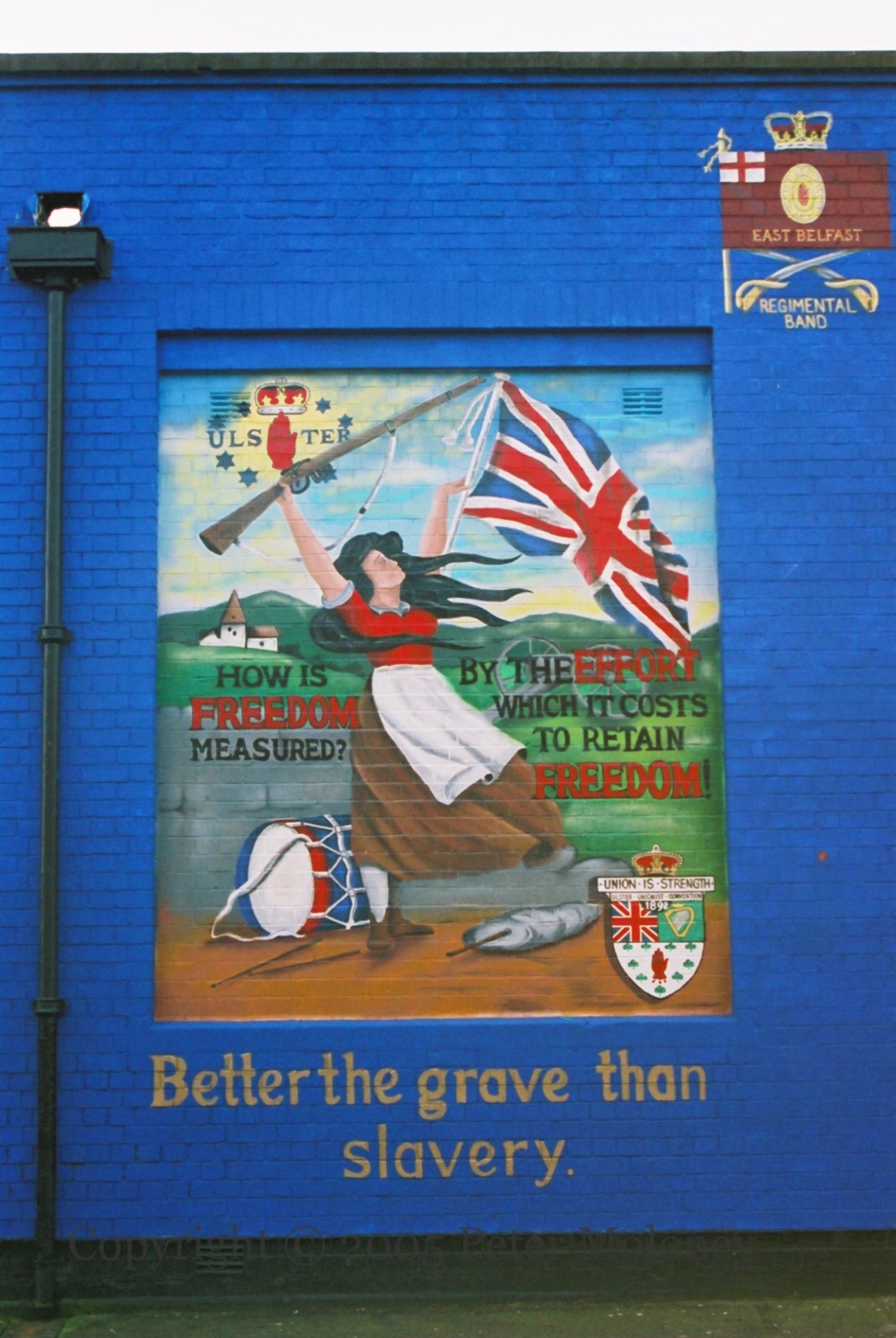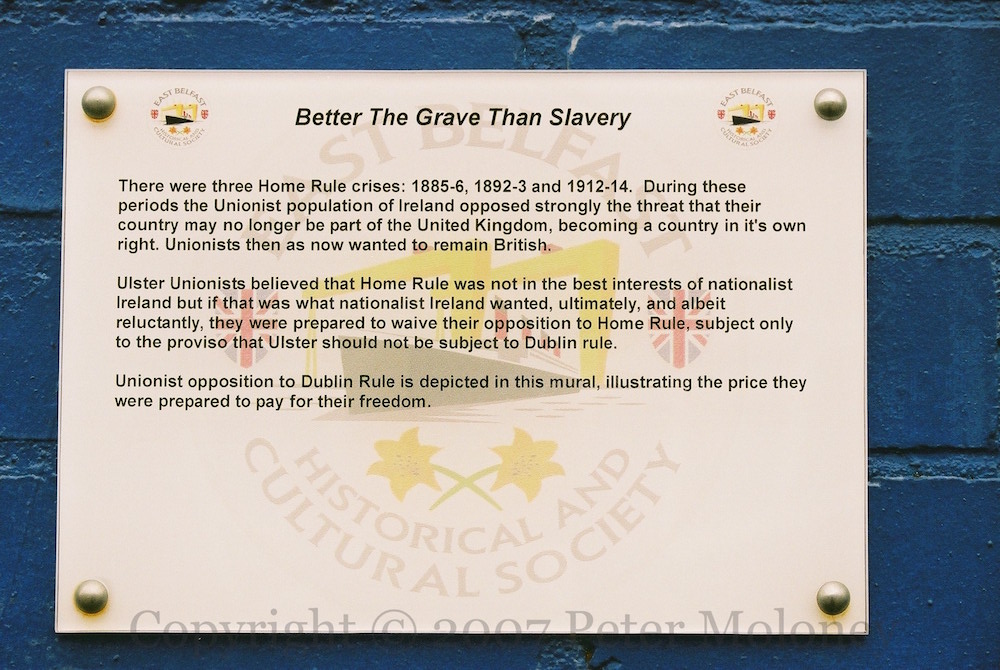 “How is freedom measured? By the effort which it costs to retain freedom!” (See also How Is Freedom Measured? and Deserted! Well – I Can Stand Alone) “Union is strength”. “There were three Home Rule crises: 1885-6, 1892-3 and 1912-14. During these periods the unionist population of Ireland opposed strongly the threat that their country may no longer be part of the United Kingdom, becoming a country in it’s own right. Unionists then as now wanted to remain British. Ulster Unionists believed that Home Rule was not the best interests of nationalist Ireland but if that was what nationalist Ireland wanted, ultimately, and albeit reluctantly, they were prepared to waive their opposition to Home Rule, subject only to the proviso that Ulster should not be subject to Dublin rule. Unionist opposition to Dublin Rule is depicted in this mural, illustrating the price they were prepared to pay for their freedom.”