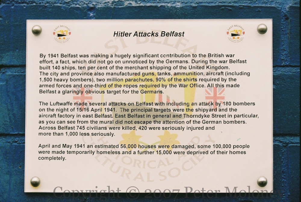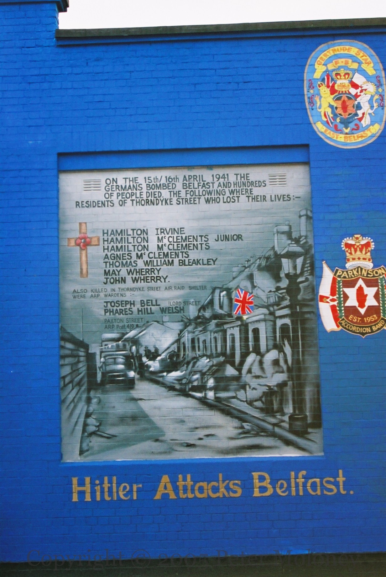 “By 1941 Belfast was making a hugely significant contribution to the British war effort, which did not go unnoticed by the Garmans. During the war Belfast built 140 ships, ten per cent of the merchant shipping of the United Kingdom. The city and province also manufactured guns, tanks, ammunition, aircraft (including 1,500 heavy bombers), two million parachutes, 90% of the shirts required by the armed forces and one-third of the ropes required by the War Office. All this made Belfast a glaringly obvious target for the Germans. The Luftwaffe made several attacks on Belfast with including an attack by 180 bombers on the night of 15/16 April 1941. The principal targets were the shipyard and the aircraft factory in east Belfast. East Belfast in general and Thorndyke Street in particular, as you can see from the mural did not not escape the attention of the German bombers. Across Belfast 745 civilians were killed, 420 were seriously injured and more than 1,000 less seriously. April and May 1941 an estimated 56,000 houses were damaged, some 100,000 people were made temporarily homeless and a further 15,000 were deprived of their homes completely.” The Thorndyke Street casualties listed are Hamilton Irvine, Hamilton McClements Junior, Hamilton McClements, Agnes McClements, Thomas William Bleakley, May Wherry, John Wherry. “Also killed in the Thorndyke Street air raid shelter were ARP wardens Joseph Bell (Lord St), Phares Hill Welsh (Paxton St Post 419).” With the emblems of Gertrude Star Flute Band and Parkinson Accordion Band.