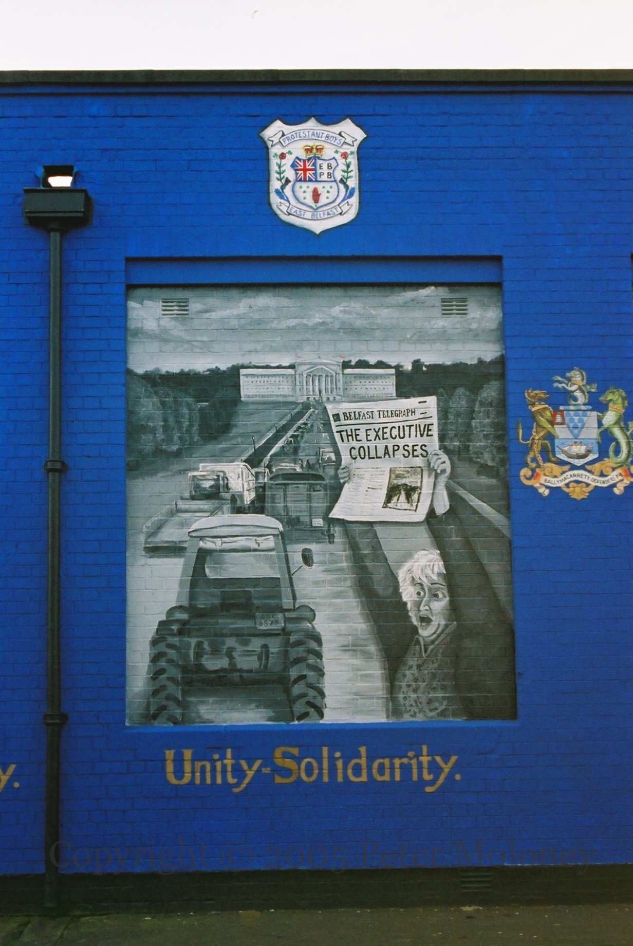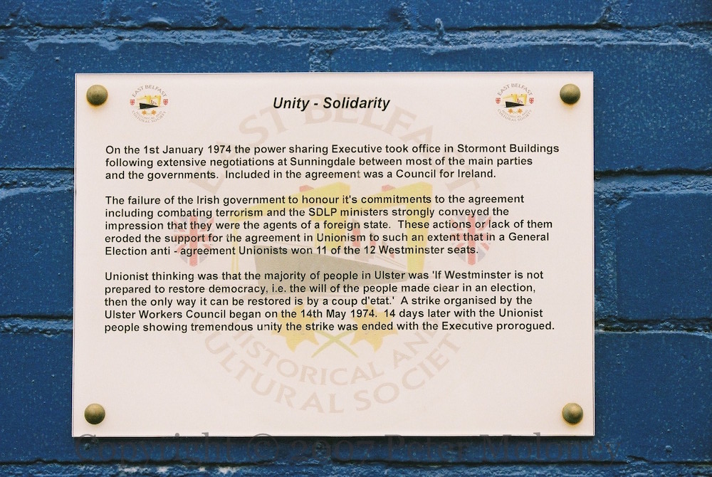 “On the 1st January 1974 the power sharing Executive took office in Stormont Building following extensive negotiations at Sunningdale between most of the main parties and the governments. Included in the agreement was a Council for Ireland. The failure of the Irish government to honour it’s commitments to the agreement including combating terrorism and the SDLP ministers strongly conveyed the impression that they were the agents of a foreign state. These actions or lack of them eroded the support for the agreement in Unionism to such an extent that in a General Election anti – agreement Unionists won 11 of the 12 Westminster seats. Unionist thinking was that the majority of people was ‘If Westminster is not prepared to restore democracy, i.e. the will of the people made clear in an election, then the only way it can be restored is by a coup d’etat.’ A strike organised by the Ulster Workers Council began on the 14th May 1974. 14 days later with the Unionist people showing tremendous unity the strike was ended with the Executive prorogued.” 10th panel on Thorndyke Street, Belfast. With emblems of the East Belfast Protestant Boys flute band and the Ballymacarrett Defenders flute band.