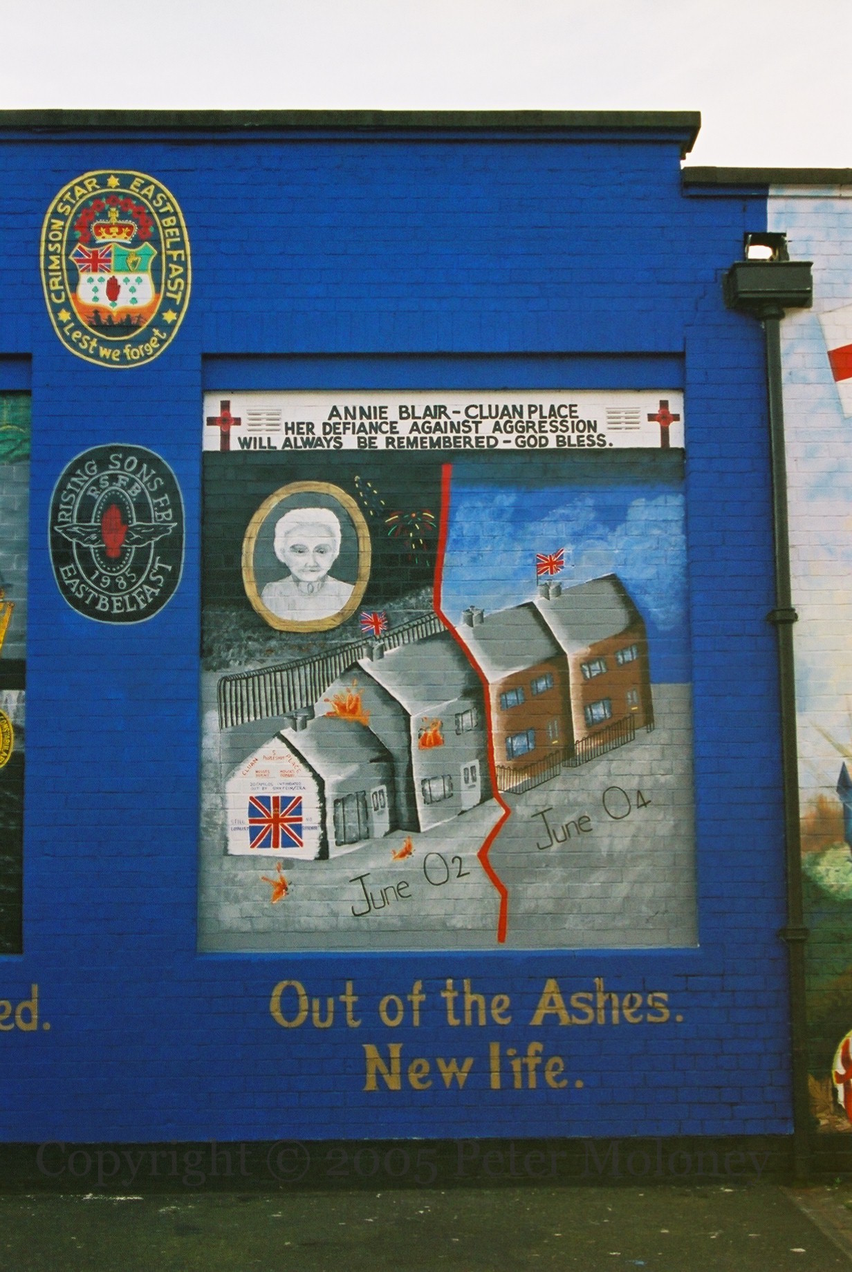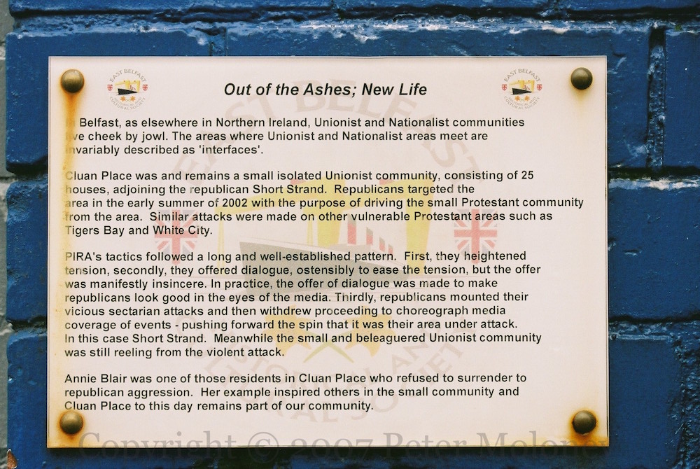 “In Belfast, as elsewhere in Northern Ireland, Unionist and Nationalist communities live cheek by jowl. The areas where Unionist and Nationalist areas meet are invariably described as ‘interfaces’. Cluan Place was and remains a small isolated Unionist community, consisting of 25 houses, adjoining the republican Short Strand. Republicans targeted the area in the early summer of 2002 with the purpose of driving the small Protestant community from the area. Similar attacks were made on other vulnerable Protestant areas such as Tigers Bay and White City. PIRA’s tactics followed a long and well-established pattern. First, they heightened tension, secondly, they offered dialogue, ostensibly to ease the tension, but the offer was manifestly insincere. In practice, the offer of dialogue was made to make republicans look good in the eyes of the media. Thirdly, republicans mounted their vicious sectarian attacks and then withdrew proceeding to choreograph media coverage of events – pushing forward the spin that it was their area under attack. In this case Short Strand. Meanwhile the small and beleaguered Unionist community was still reeling from the violent attack. Annie Blair was one of those residents in Cluan Place who refused to surrender to republican aggression. Her example inspired others in the small community and Cluan Place to this day remains part of our community”. See also: Welcome To Loyalist Cluan Place.