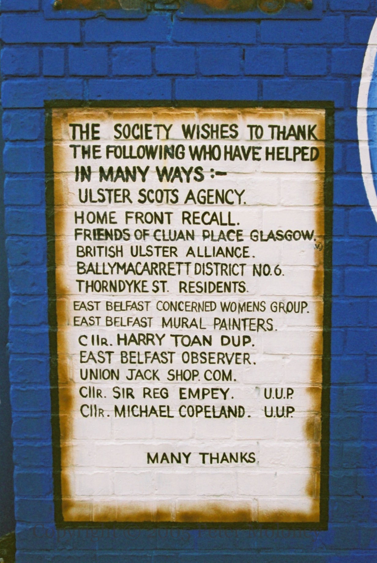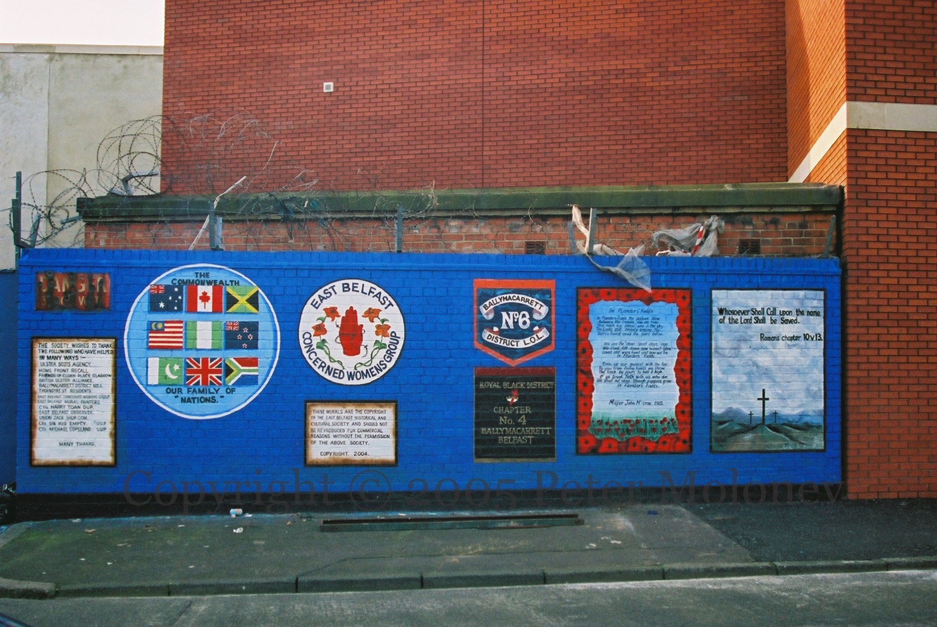 This entry features the final (side) wall to the right of the series of murals in Thorndyke Street. (For a list of entries for each panel, see East Belfast Historical And Cultural Society.) The various small panels thank a number of agencies, leading with the Ulster Scots Agency, and claim a copyright over the murals – which is something unusual with public art. There is also a verse from Romans (10v13) and Canadian physician John McCrae’s (1872-1918) poem In Flanders’ Fields: