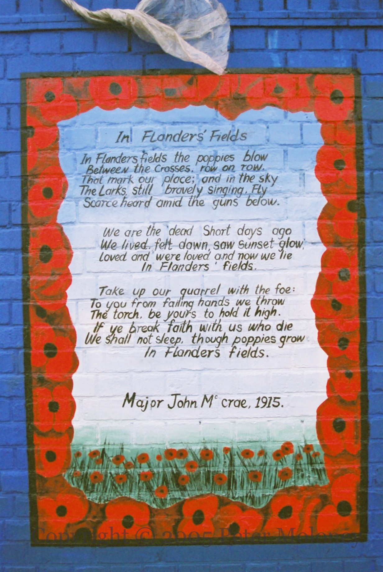 “In Flanders fields the poppies blow/Between the crosses, row on row/That mark our place; and in the sky/The larks, still bravely singing, fly/Scarce heard amid the guns below.