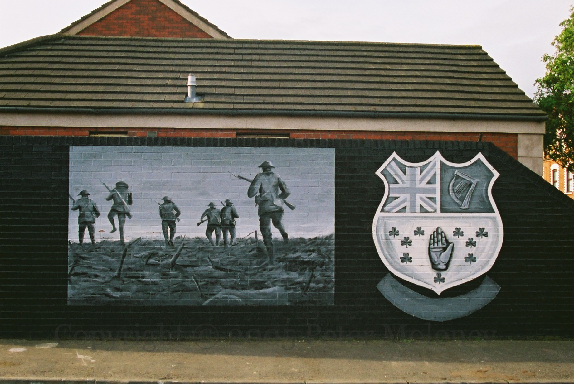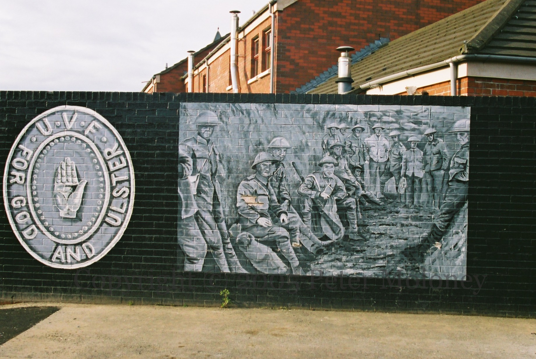 Two images from the Imperial War Machine (Men Resting | Recreation of men going over the top on the first day of the Battle Of The Somme) are reproduced in a Pansy Street, Belfast, mural commemorating the Ulster Volunteers and the Young Citizen Volunteers.