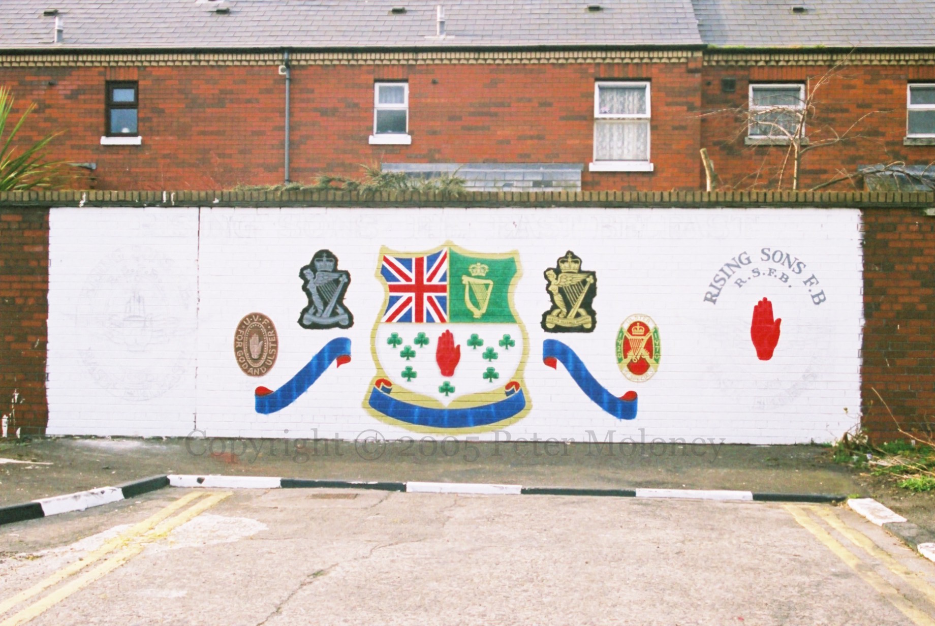 In-progress image of the Rising Sons (Fb) mural in Bright St/Newtownards Road, Belfast, with Ulster Volunteers, Royal Irish Rifles, UDR, B-Specials, and (in the centre) 36th (Ulster) Division insignia. For the finished product see X00759.