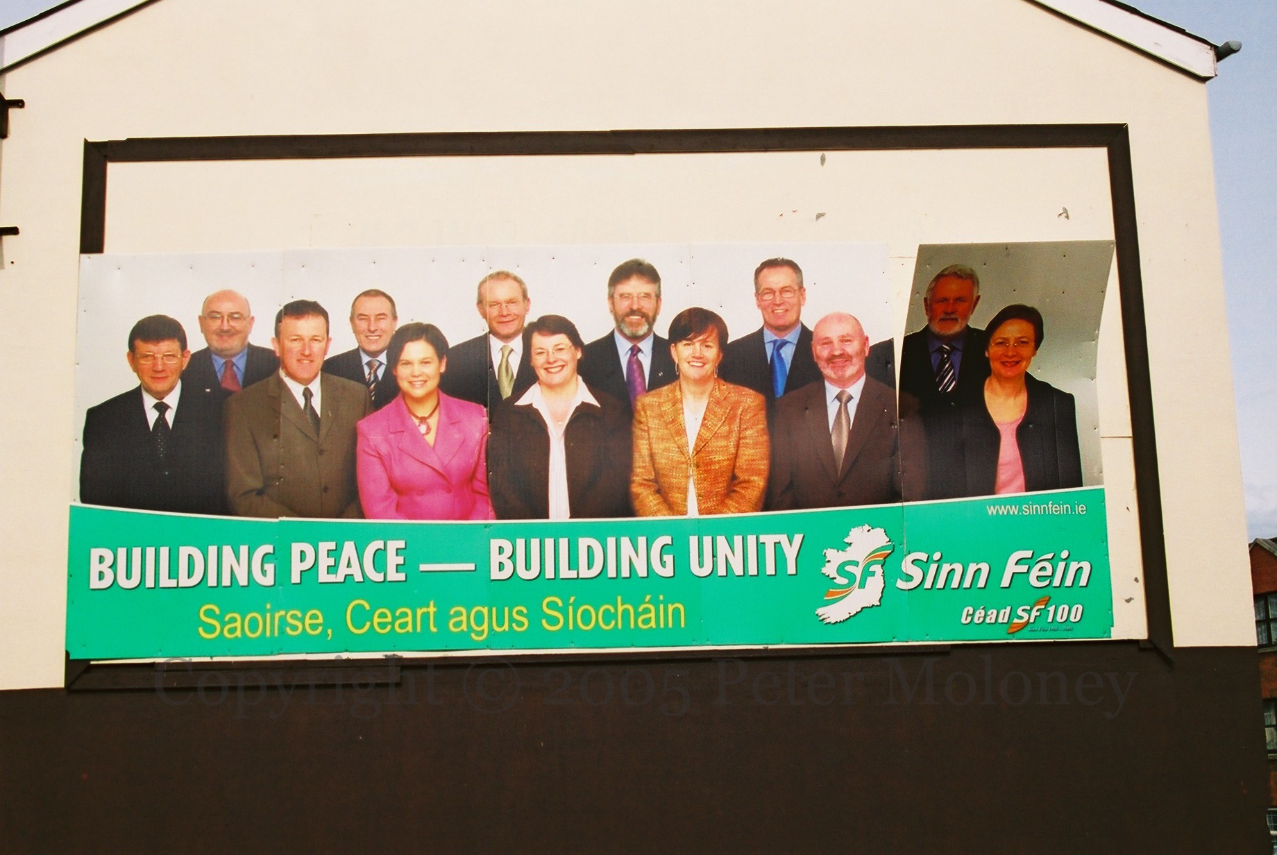 Building Peace, Building Unity 2005-02-222025-02-27Extramural Activity “Saoırse, ceart, agus síocháın” (“Freedom, justice, and peace”). Sınn Féın electoral board on Falls Road/Linden Street. 2005 was the 100th anniversary of the founding of the party. Click image to enlargeCopyright © 2005 Peter MoloneyM02285 Share this: Click to share on X (Opens in new window) X Click to share on Facebook (Opens in new window) Facebook Like Loading... Related
