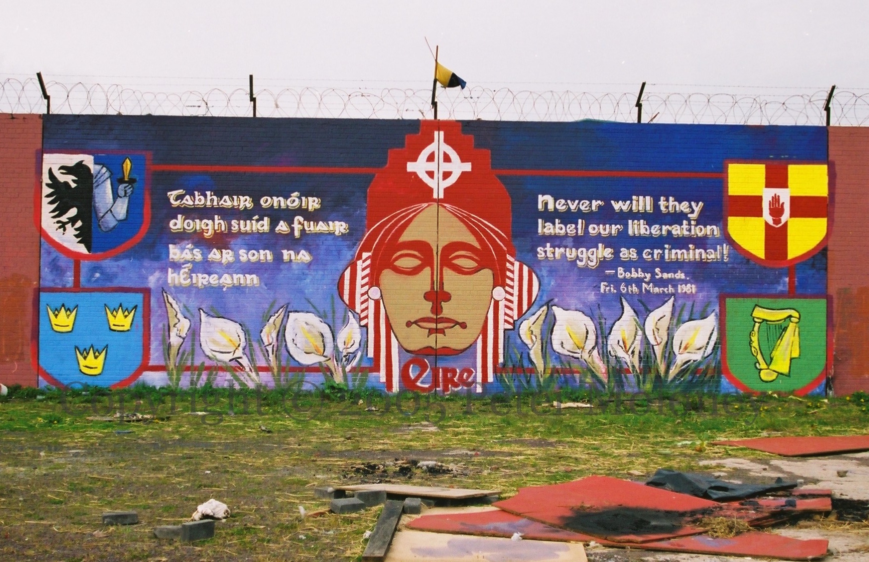 “Tabhaır onóır doıgh suíd a fuaır bás ar son na hÉıreann” [corrupted Irish with the general meaning “Honor … who died for Ireland”]. “Never will they label our liberation struggle as criminal! – Bobby Sands Fri. 6th March 1981”. Another Éıre mural was previously further down the wall on Mountpottinger Road, Belfast.