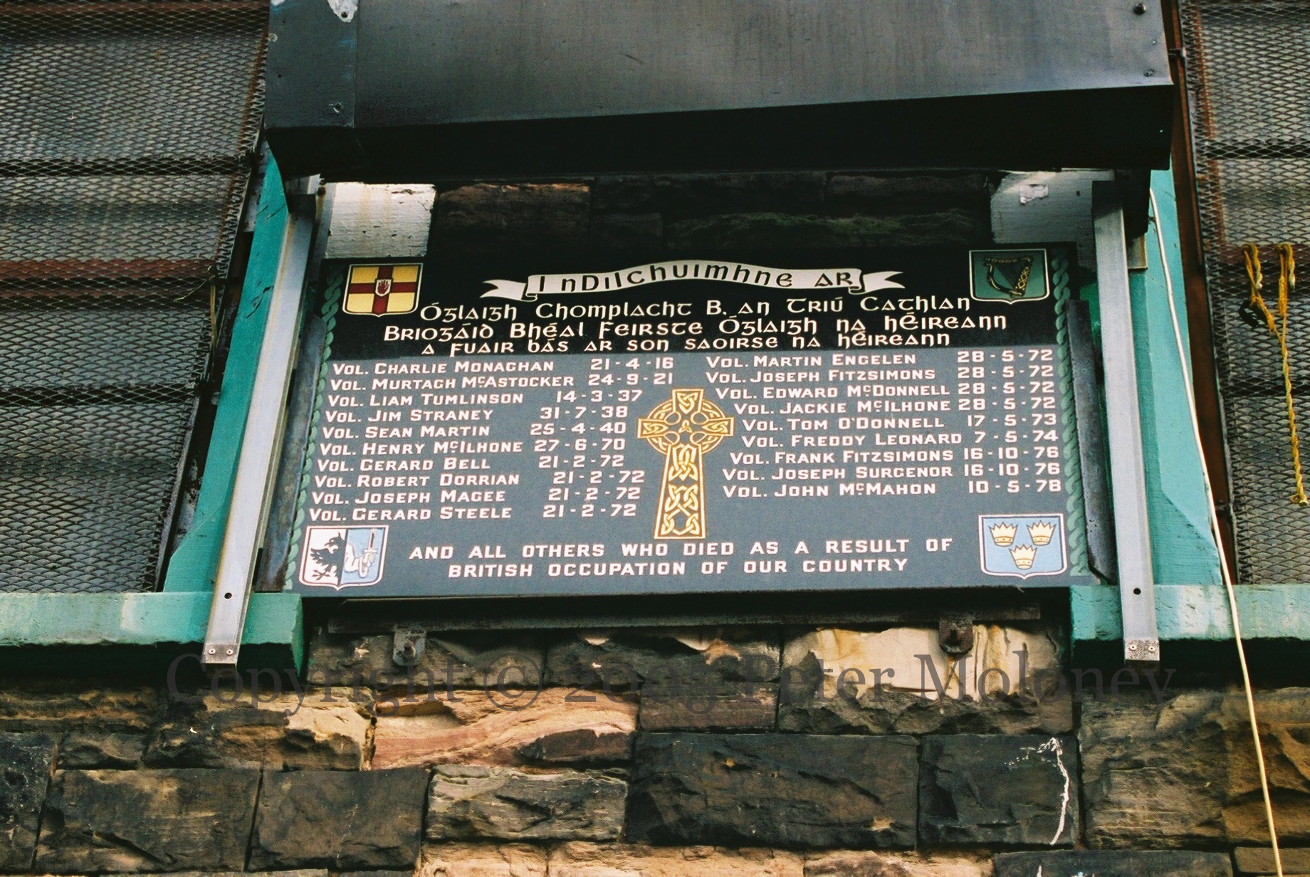 “I ndılchuımhne ar óglaıgh chomplacht B an trıú cathlan brıogáıd Bhéal Feırste Óglaıgh na hÉıreann a fuaır bás ar son saoırse na hÉıreann and all others who died as a result of British occupation of our country.” Roll of honour for IRA volunteers (up to 1978) in and from east Belfast, beginning with Charlie Monaghan/Monahan who died in 1916 the day before the Rising and who would get a mural in 2006 (and another in the Markets in 2017), as would Sean Martin who died in 1940.