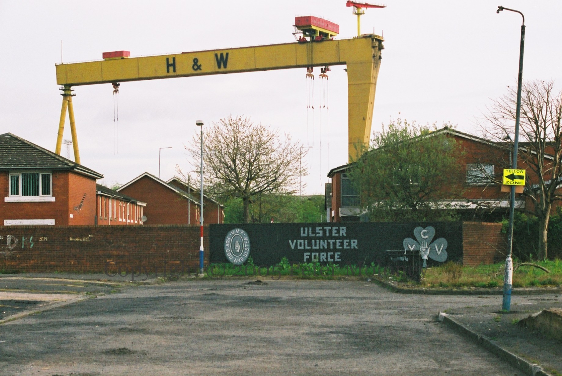Ulster Volunteer Force 2005-02-282025-02-27Extramural Activity UVF and YCV insignia in Pitt Place, east Belfast, in the shadow of one of the H&W cranes, with the community centre (Ballymac) on the right. Click image to enlargeCopyright © 2005 Peter MoloneyM02362 Share this: Click to share on X (Opens in new window) X Click to share on Facebook (Opens in new window) Facebook Like Loading... Related