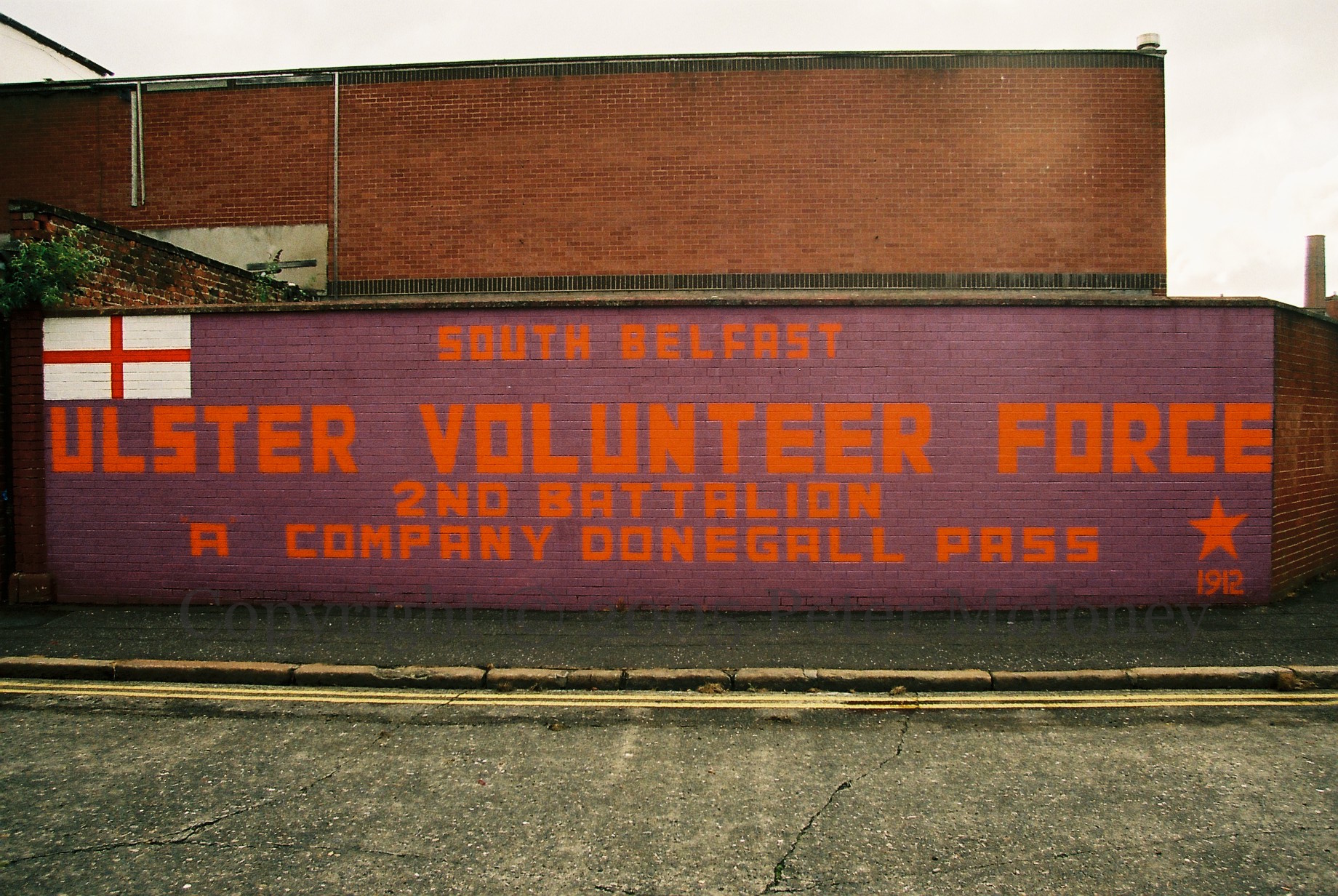 The flag of the Orange Order has a St George’s Cross and an orange five-pointed star on a purple field. The reverse colours (orange star, purple background) are used here as a UVF and Ulster Volunteers (1912) flag.