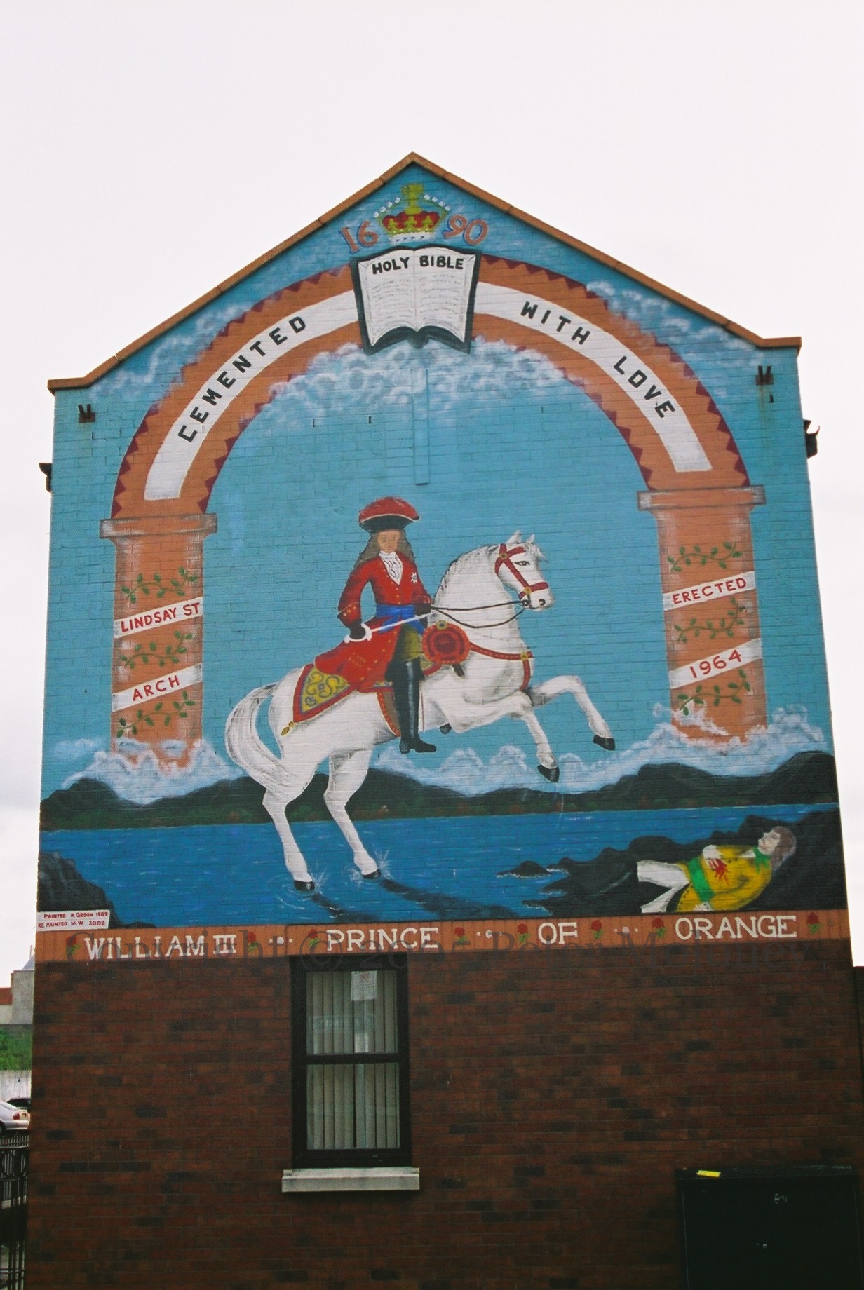 This is an image of the 2002 repaint, with the addition of the Lindsay Street Arch, crown and bible, and lower border, of the King William III, prince of Orange, mural in Elm Street, south Belfast. The original was painted in 1989.