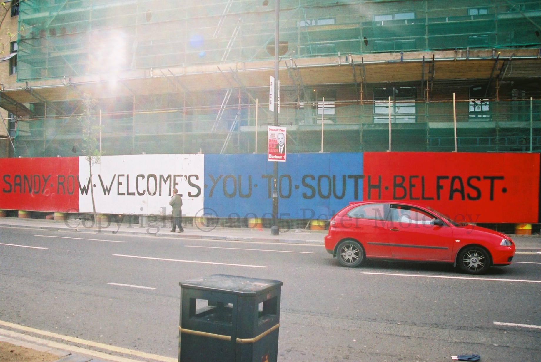 Sandy Row Welcomes You To South Belfast 2005-03-152025-02-27Extramural Activity The hoarding around a construction site is taken over by loyalist paramilitaries: “Sandy Row welcome’s you to south Belfast”, with UFF and UFA insignia. Donegall Road, south Belfast Click image to enlargeCopyright © 2005 Peter MoloneyM02397 M02398 Share this: Click to share on X (Opens in new window) X Click to share on Facebook (Opens in new window) Facebook Like Loading... Related