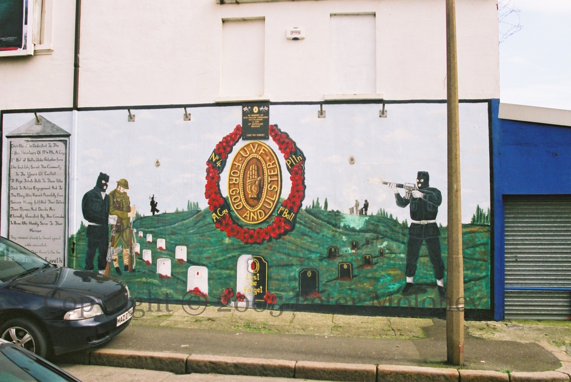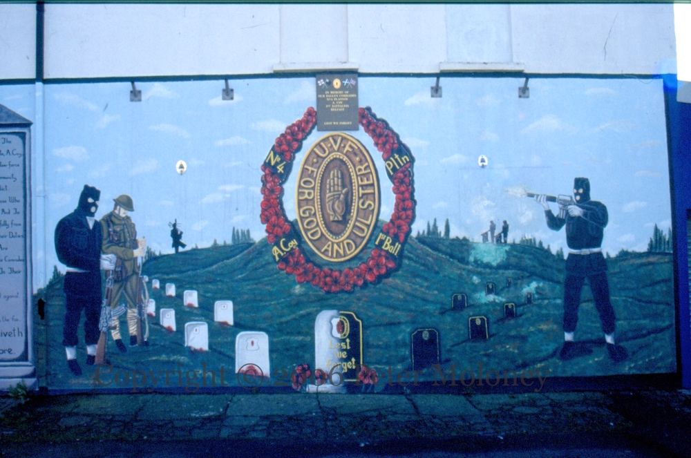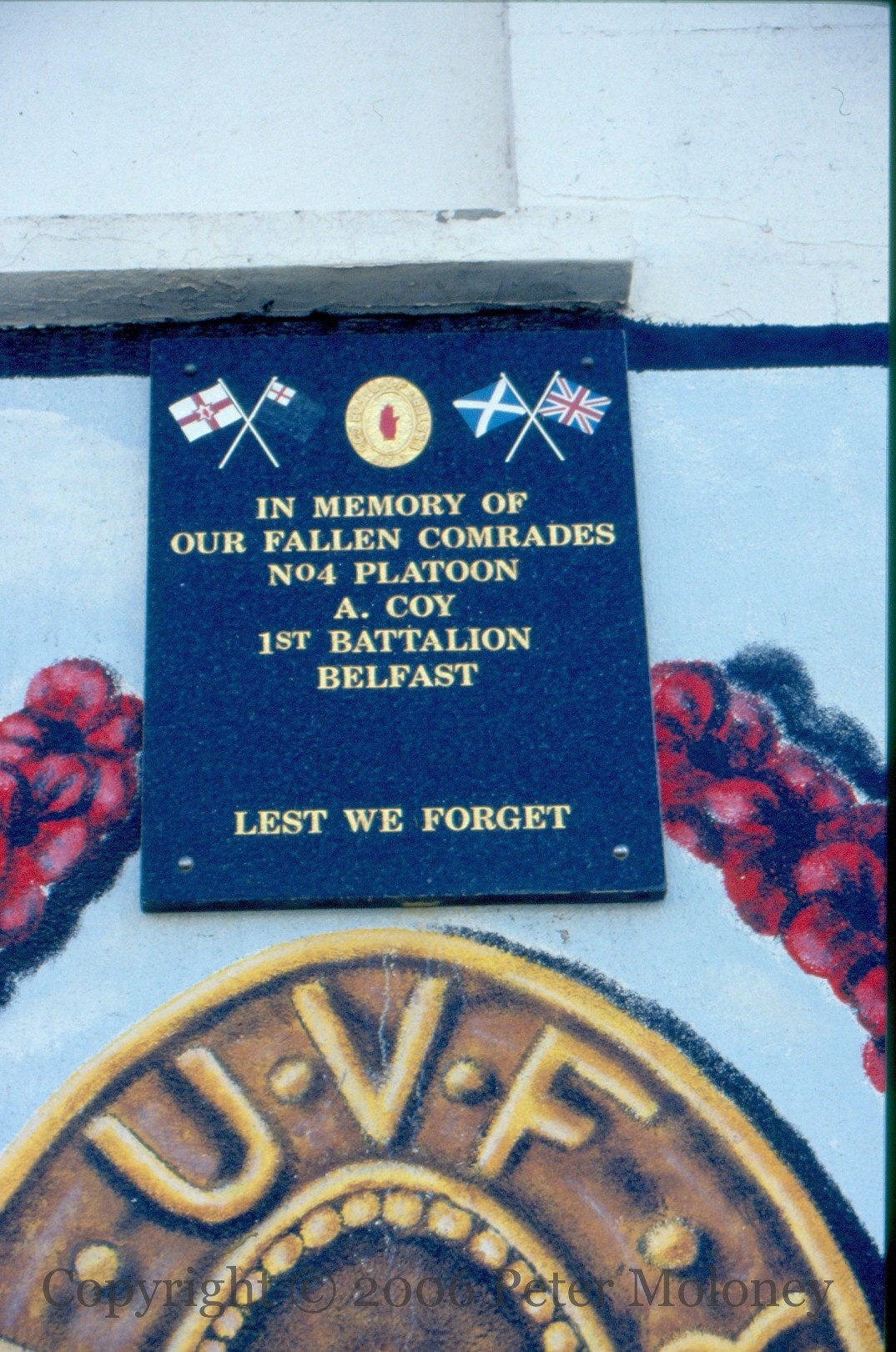 “This mural is dedicated to the fallen volunteers of No 4 Pltn A Coy, 1st Belfast Battn, Ulster Volunteer Force who dutifully served this community in the years of conflict. It pays tribute to those who died in active engagement and to the many who passed peacefully from service having fulfilled their duties. Their names and deeds are eternally venerated by their comrades in arms who humbly serve in their honour. They remained staunch to the end against odds uncounted, they fell with their faces to the foe, their name liveth forevermore.“