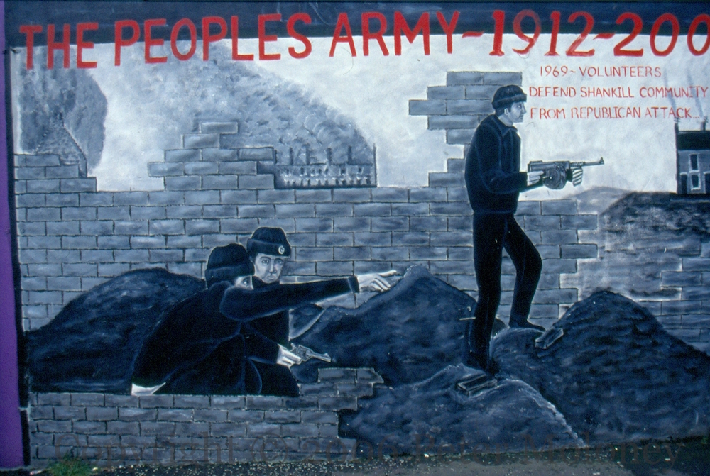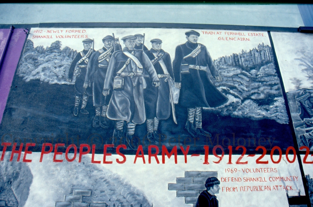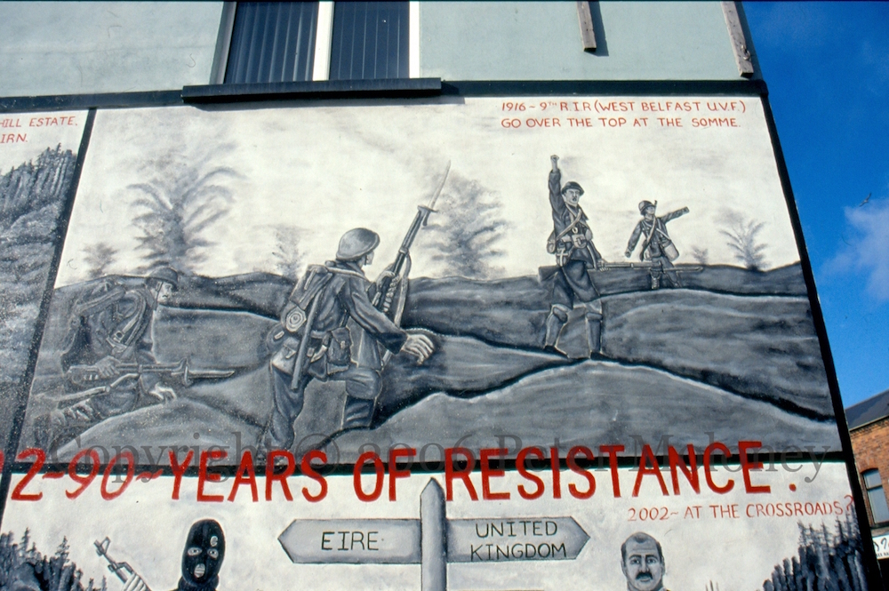On the left, “this mural is a memorial to the volunteers of ‘A’ Coy 1st Batt who served the Shankill community so bravely during the years of conflict. Gone but not forgotten. Here lies a soldier.” On the right, landmarks in the history of the Ulster Volunteers and UVF: “1912 – newly formed Shankill Volunteers train at Fernhill Estate, Glencairn. 1916 – RIR (West Belfast UVF) go over the top at the Somme. 1969 – Volunteers defend Shankill community from republican attack. 2002 – At the crossroads?” with PUP leader David Ervine pictured holding a copy of the Good Friday Agreement. Canmore St, Belfast.