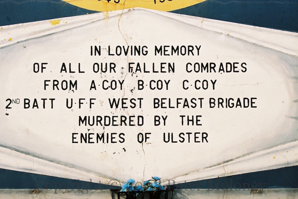 “In loving memory of all our fallen comrades from A Coy, B Coy, C Coy, 2nd Batt UFF West Belfast Brigade. Murdered by the enemies of Ulster.” UDA Lieutenant-Colonel McCullough was killed by the INLA on October 16th, 1981, outside his home in Denmark Street (out of frame to the right), on information supplied by fellow UDA member James Craig, who feared that McCullough would expose his embezzling of UDA funds. Hopewell Crescent, Belfast.