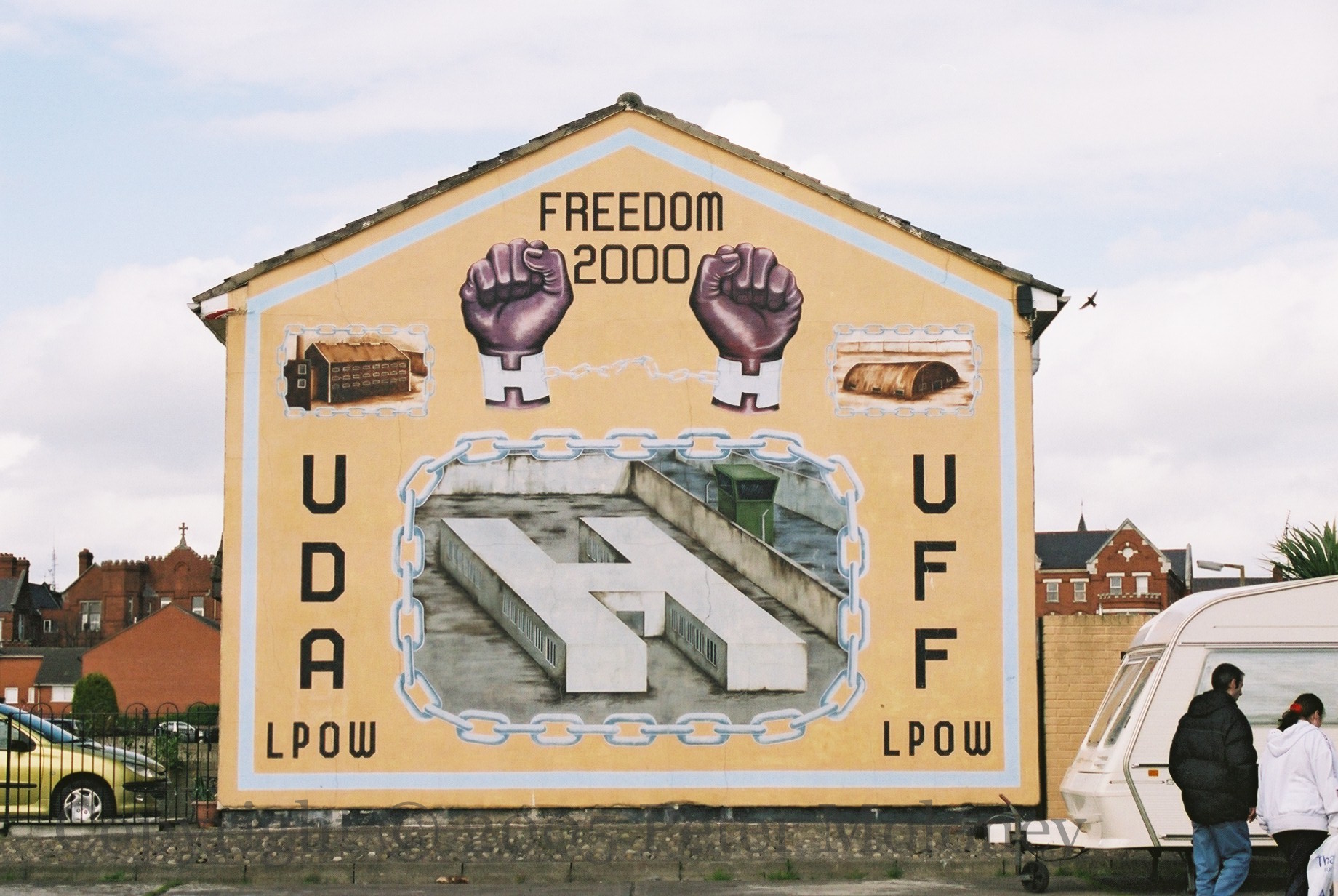 Almost all political prisoners, both republican and loyalist, had been released, under the terms of the Good Friday Agreement, by July 28th, 2000. The mural above shows the huts of Long Kesh and the H-blocks of the Maze.