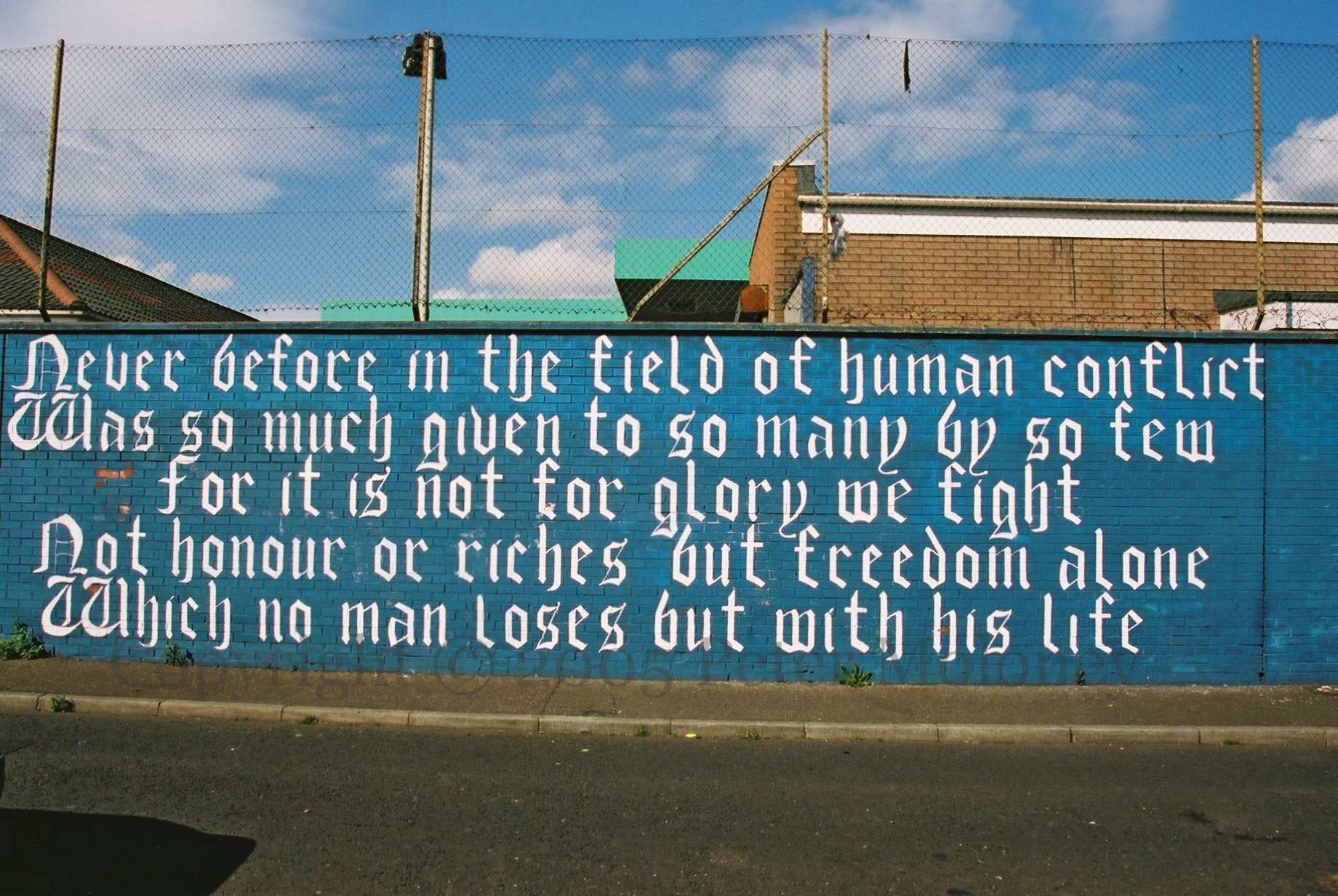 “Never before in the field of human conflict was so much given to so many by so few” is based on Churchill’s speech to the House of Commons on August 20th, 1940, which read “Never in the field of human conflict was so much owed by so many to so few”. “[For] It is not for glory that we fight, not honour or rich but freedom alone which no man loses but with his life.” echoes the Declaration of Arbroath “for, as long as but a hundred of us remain alive, never will we on any conditions be brought under English rule. It is in truth not for glory, nor riches, nor honours that we are fighting, but for freedom – for that alone, which no honest man gives up but with life itself.”