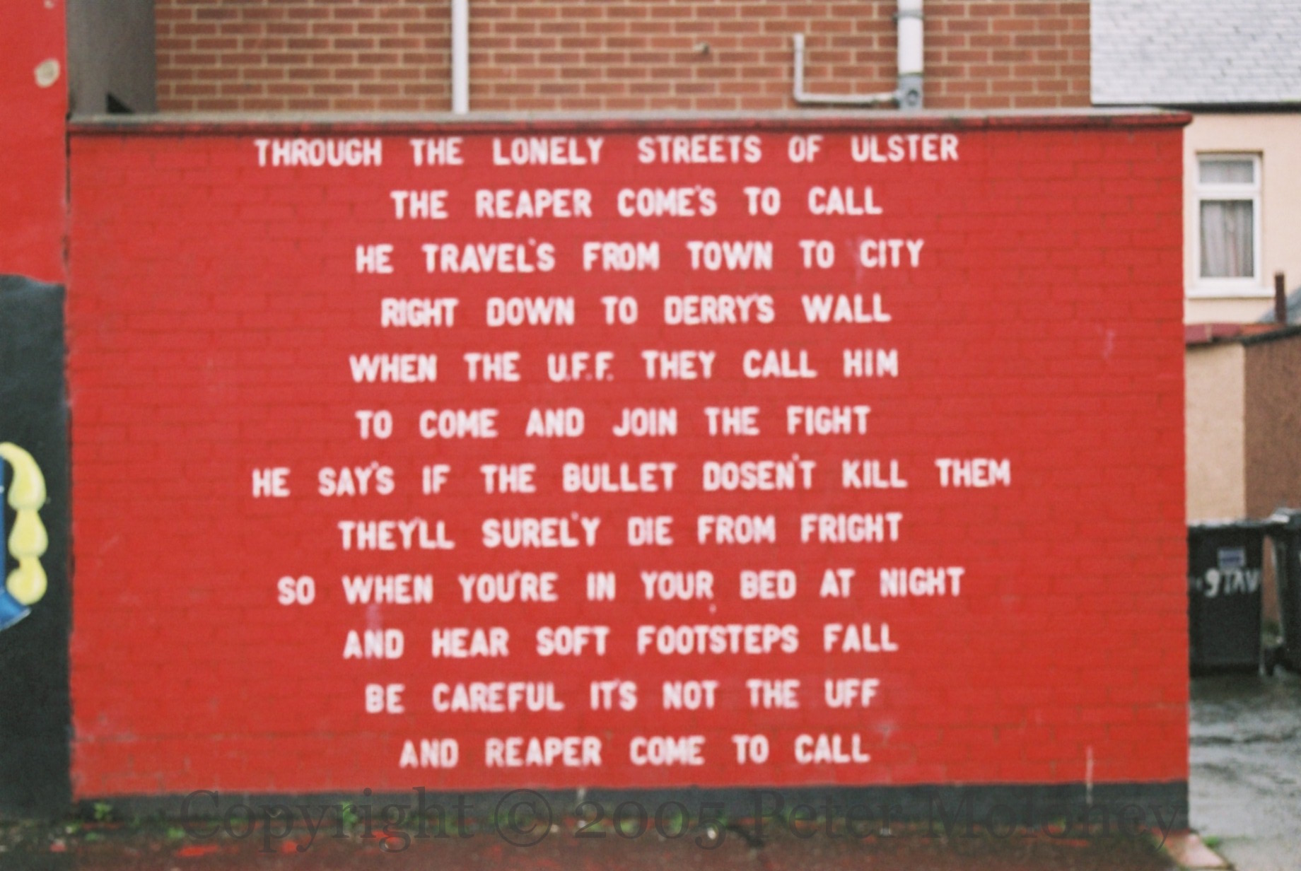 “Through the lonely streets of Ulster/the reaper come’s to call/He travel’s from town to city/Right down to Derry’s wall/When the UFF they call him/To come and join the fight/He say’s if the bullet doesn’t kill them/They’ll surely die from fright/So when you’re in your bed at night/And hear soft footsteps fall/Be careful it’s not the UFF/And reaper come to call.” Iron Maiden’s ‘Eddie The Head’ in UFF fatigues (see the Visual History page for Eddie) with a list of the urban Belfast companies in the South Belfast brigade.