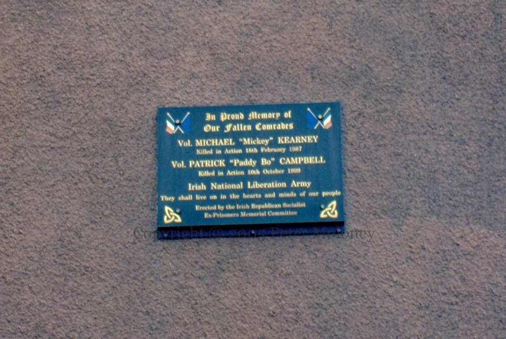 “In proud memory of our fallen comrades Vol. Michael “Mickey” Kearney, killed in action 18th February 1987, Vol. Patrick “Paddy Bo” Campbell, killed in action 10th October 1999. Irish National Liberation Army. They shall live in the hearts and minds of our people. Erected by the Irish Republican Socialist Ex-Prisoners Memorial Committee.” (Sutton entries at CAIN)