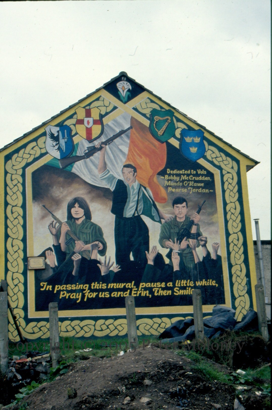 “Dedicated to Vols Bobby McCrudden, Mundo O’Rawe, Pearse Jordan. In passing this mural pause a little while, pray for us and erin, then smile.” Ballymurphy mural to three local PIRA volunteers. O’Rawe’s pose (in the centre) perhaps owes something to the poster for the 1996 film Michael Collins. The plaque reads “I ndíl [sic] chuímhne [sic] Oglach [sic] Edward ‘Mundo’ O’Rawe, Oglach [sic] Robert McCrudden, Oglach [sic] Pearse Jordan Who gave their lives for Ireland’s freedom.”