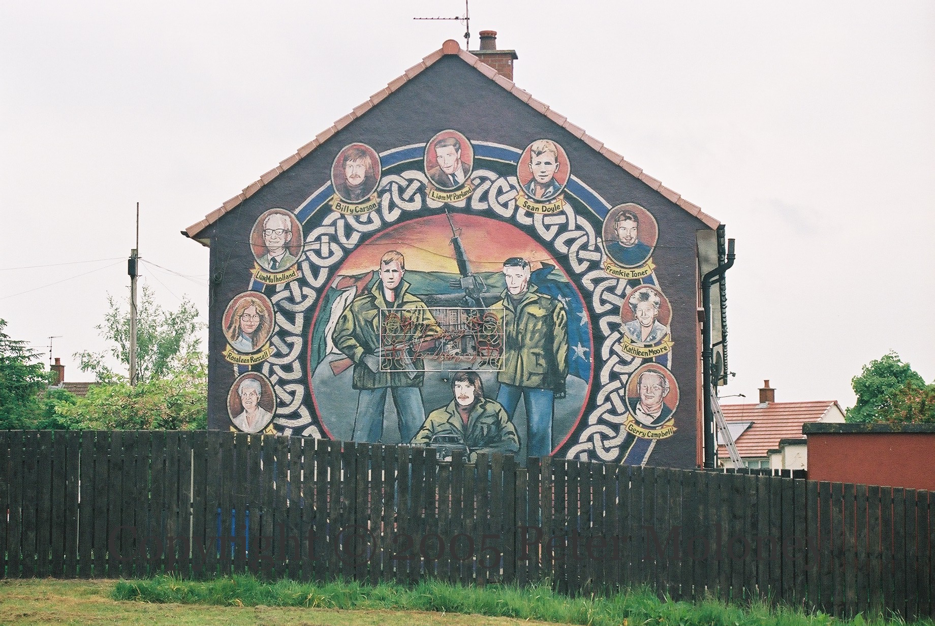 This is a Whiterock Road, Belfast, mural to three IRA volunteers and six other local activists. Clockwise from bottom left: Annie Adams, Rosaleen Russell, Liam Mulholland, Billy Carson (also shown kneeling; killed by the UDA in 1979), Liam McParland (also standing, right; leader of the (pre-split) IRA in Ballymurphy, died in a car crash on 6 November 1969), Sean Doyle (also standing, left; perhaps from 1944 despite the assault rifle), Frankie Toner, Kathleen Moore, Gerry Campbell. There are Christmas lights in the centre of the wall.
