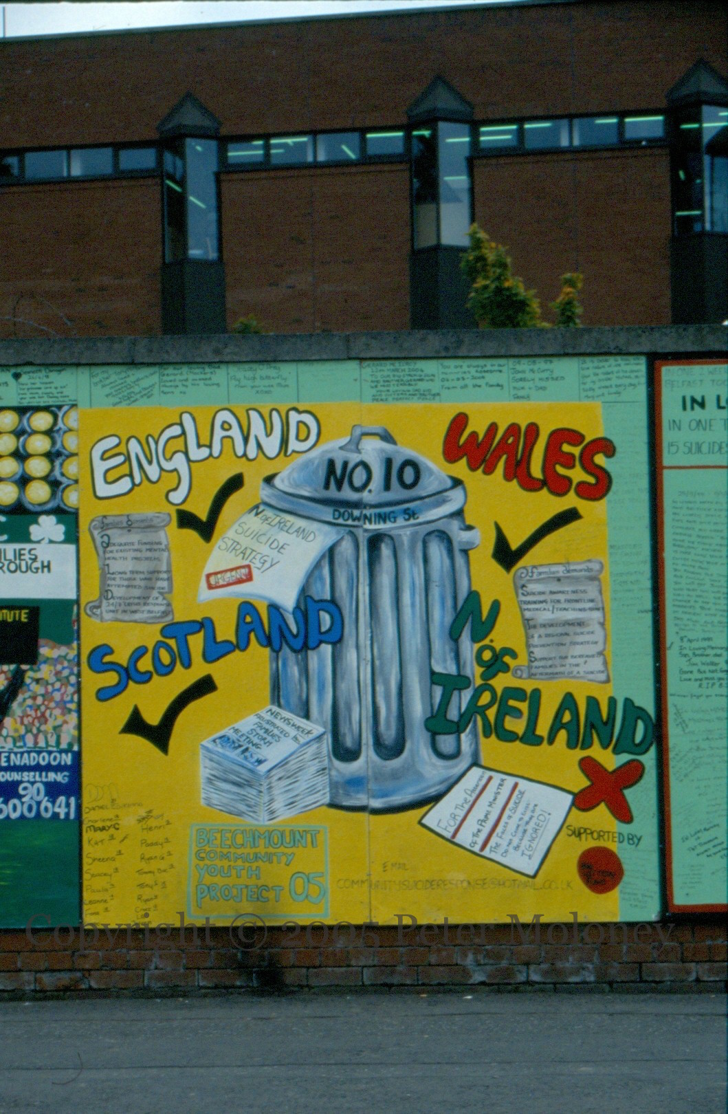 A ‘suicide strategy’ for “N of Ireland” languishes in the dustbin of 10 Downing Street, unlike strategies for Scotland, England, and Wales. The mural is produced by “Beechmount Community Youth Project”. To the right are messages to the recently deceased: “In one 2 week period 13 young men in north Belfast took their own lives”, “In one three month period 15 suicides in west Belfast occurred”.