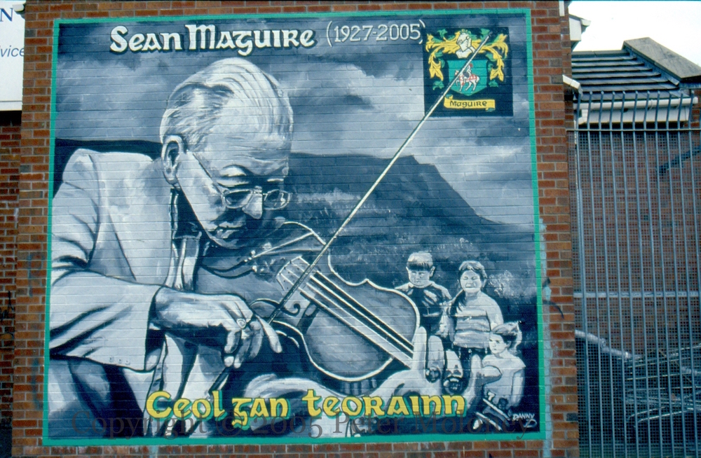 “Ceol gan teoraınn” – “unlimited music” or “music without boundaries”. Belfast’s Sean Maguire (also McGuire) (1927-2005) was an All-Ireland fiddle champion and world-wide ambassador for traditional music (WP).