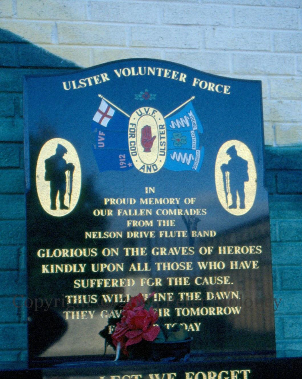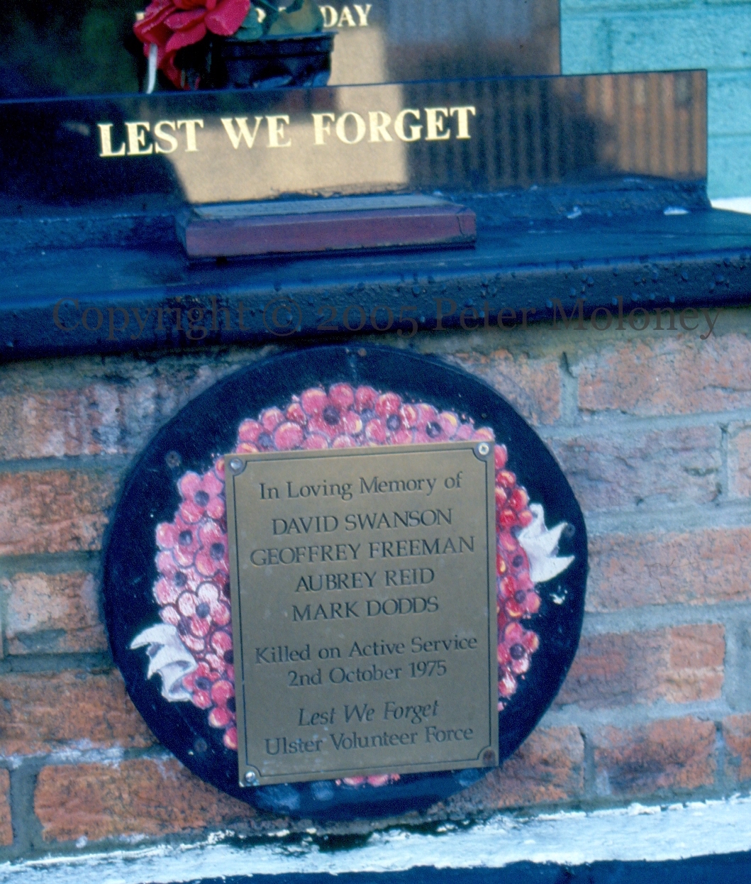 “In proud memory of our fallen comrades from the Nelson Drive Flute Band. Glorious on the graves of heroes, kindly upon all those who have suffered for the cause. Thus will shine the dawn. They gave their tomorrow for our today.” “In loving memory of David Swanson, Geoffrey Freeman, Aubrey Reid, Mark Dodds, killed on active service 2nd October 1975. Lest we forget. Ulster Volunteer Force.” The four volunteers died when the car bomb they were carrying exploded prematurely.