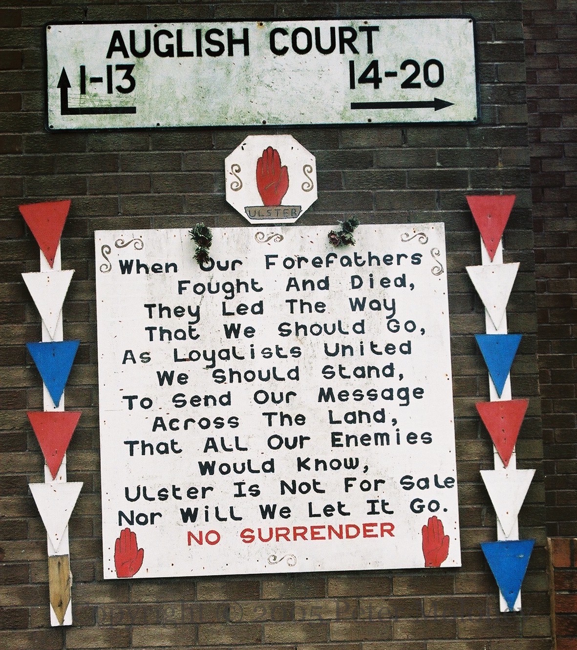 “When our forefathers fought and died, they led the way that we should go, as loyalists united we should stand, to send our message across the land, that all our enemies would know, Ulster is not for sale nor will we let it go. No surrender.”