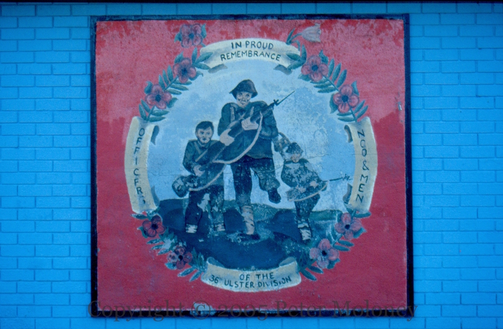 “In proud remembrance of the 36th (Ulster) Division, officers, NCO, and men.” The UVF symbol in the third panel is bordered with barbed wire.