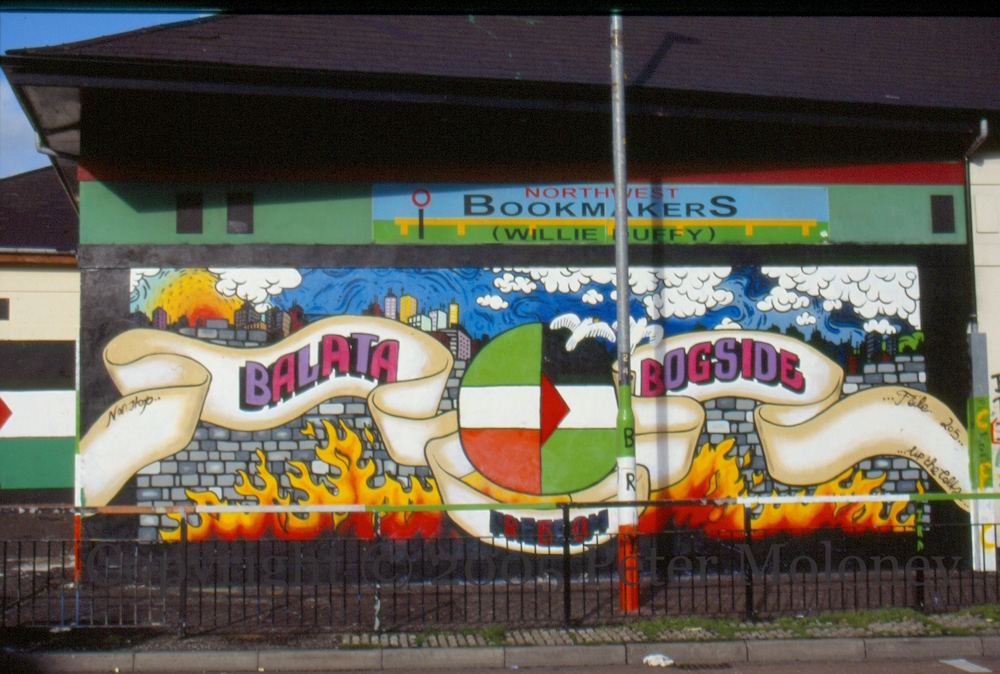 “Freedom”. Balata is a Palestinian refugee camp in the West Bank, near Nablus. The Bogside is a Catholic area of Derry, west of the old city walls. Lecky Road, Derry. “Féıle 20[0]5”, “Up the Celts”.