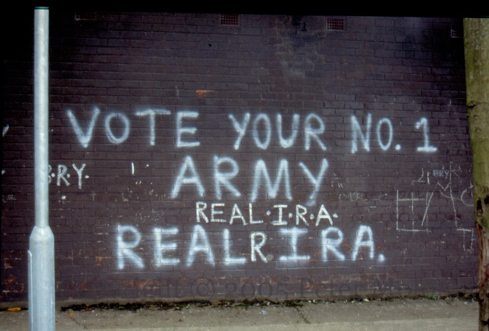 Vote Your No.1 Army 2005-07-162025-03-01Extramural Activity “Vote your no.1 army – Real IRA” – presumably a plea for political support rather than a popularity poll for armies. Gartan Square, Bogside, Derry Click image to enlargeCopyright © 2005 Peter MoloneyM02664 Share this: Share on X (Opens in new window) X Share on Facebook (Opens in new window) Facebook Like Loading... Related