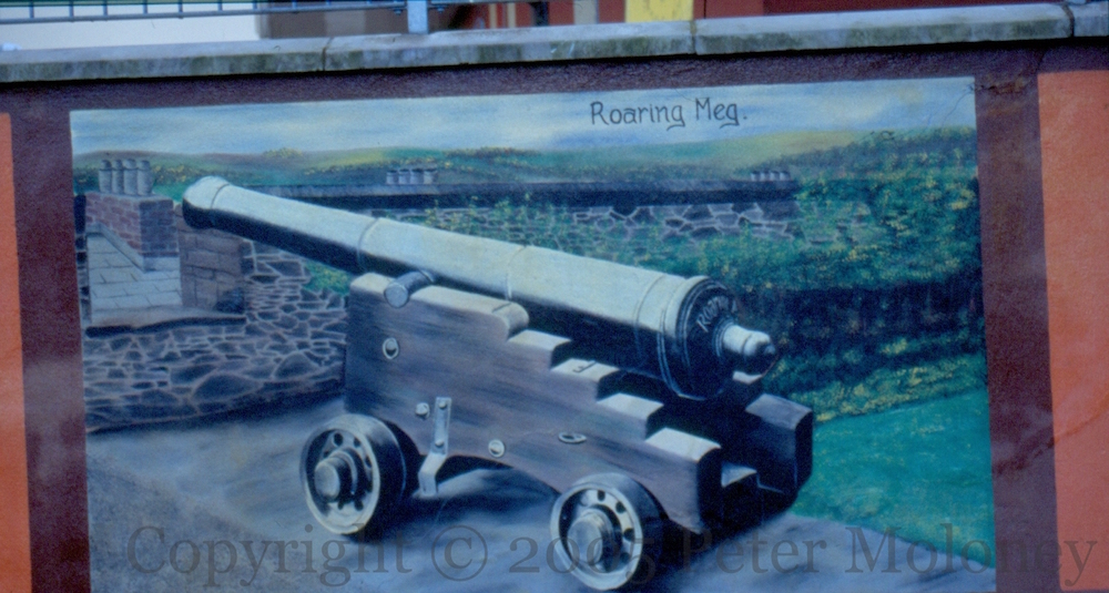 This series of five panels is outside the Cathedral Youth Club in The Fountain, Londonderry. In order, they show: a cry of “No Surrender” by the Apprentice Boys, Breaking The Boom, Walker’s Monument (to George Walker, governor during the siege and killed at the Boyne; the statue was blown up on 19730, Roaring Meg (the 1642 cannon), and the Cathedral (St Columb’s).