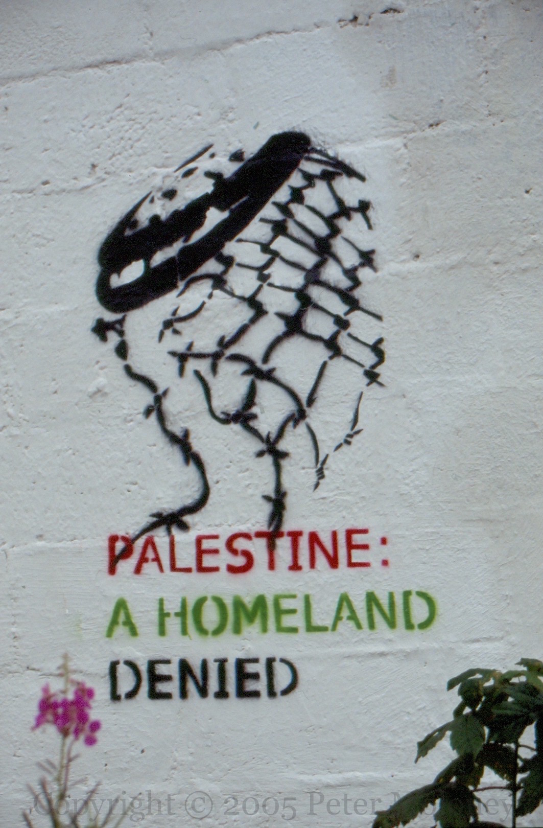 Palestine: A Homeland Denied 2005-07-292025-02-28Extramural Activity The keffiyeh, familiar from images of PLO leader Yasser Arafat who died in 2004, is joined by barbed wire. The words are in the colours of the Palestinian flag. Lecky Road, Derry. Click image to enlargeCopyright © 2005 Peter MoloneyM02679 Share this: Share on X (Opens in new window) X Share on Facebook (Opens in new window) Facebook Like Loading... Related