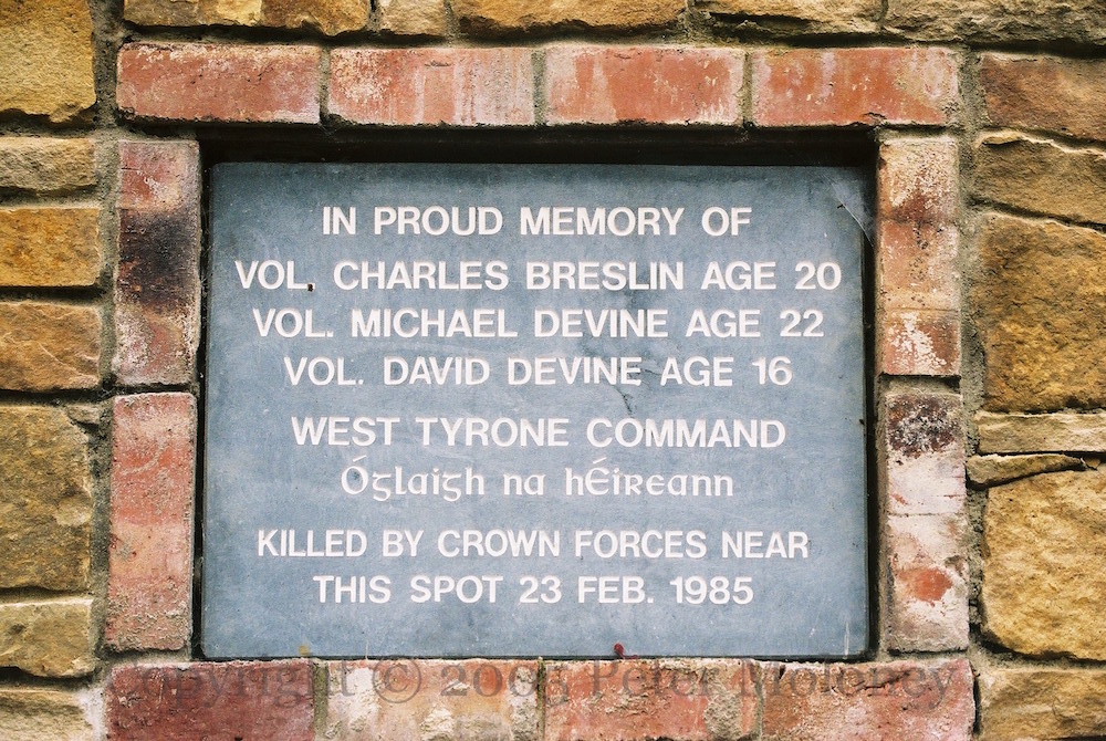 “In proud memory of Vol. Charles Breslin age 20, Vol. Michael Devine age 22, Vol. David Devine age 16. West Tyrone command, Óglaıgh na hÉıreann. Killed by crown forces near this spot23 Feb. 1985.” The three were killed in an alleged shoot-to-kill incident. Obituaries in An Phoblacht.