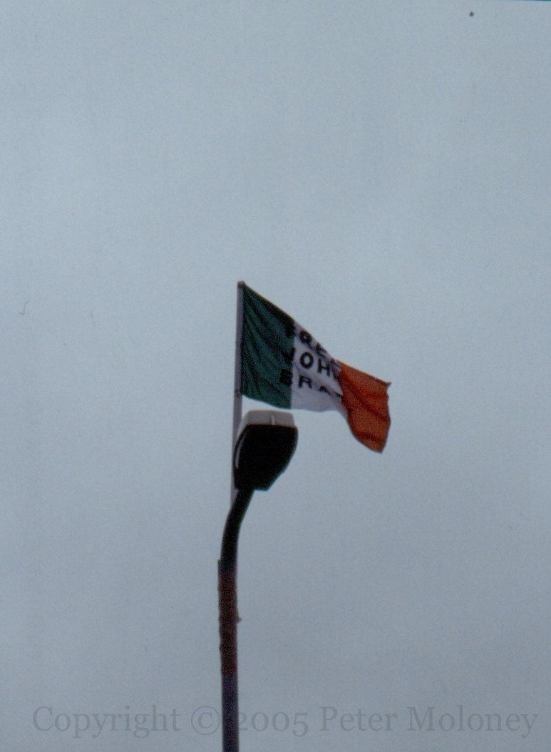 Real IRA volunteer John Brady was arrested in 2003 and charged with possession and returned to prison in 2004 and in September 2005 – the time-period of the flag above – charged with the attempted murder of an RIR officer in 2002 (IndyMedia). (The case, based on DNA evidence would collapse.)