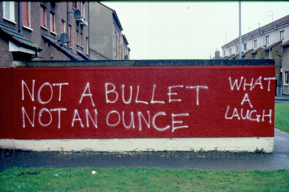What A Laugh 2006-01-102025-03-02Extramural Activity Commentary on earlier promises not to decommission: “”Not a bullet, not an ounce” – what a laugh.” Dove Gardens/Stanley’s Walk, Derry. Click image to enlargeCopyright © 2006 Peter MoloneyM02694 Share this: Click to share on X (Opens in new window) X Click to share on Facebook (Opens in new window) Facebook Like Loading... Related