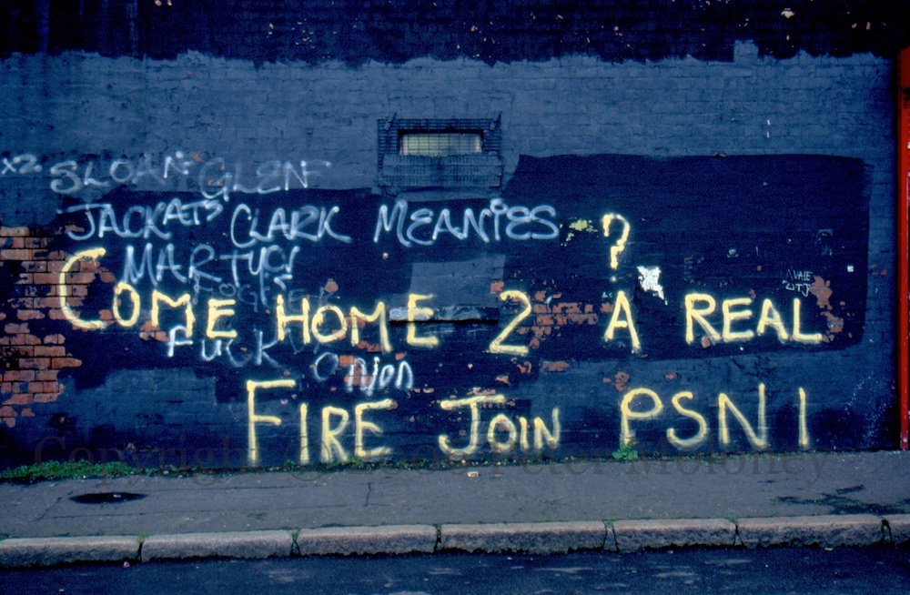 A vintage republican graffito (e.g. Getty Images) against the RUC is resurrected for use in loyalist Woodvale. Both refer to the “Real Fire” ad campaign from the 80s (e.g. one | two). The Solid Fuel Advisory Service still (2018) uses the image of the dog, cat, and mouse side-by-side.