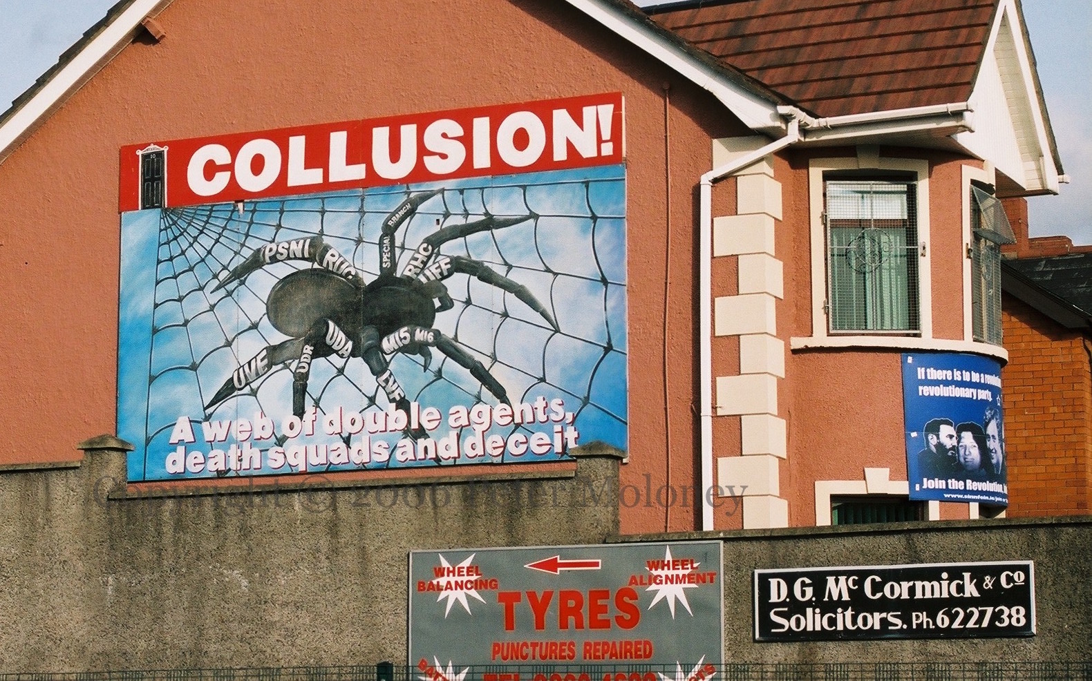 “Collusion – a web of double agents, death squads and deceit.” The legs of the spider are marked “PSNI/RUC”, “Special Branch”, “RHC”, “UFF”, “MI5/MI6”, “LVF”, “UDR/UDA”, “UVF”. The web is emanating from the door to 10 Downing Street in the top left.