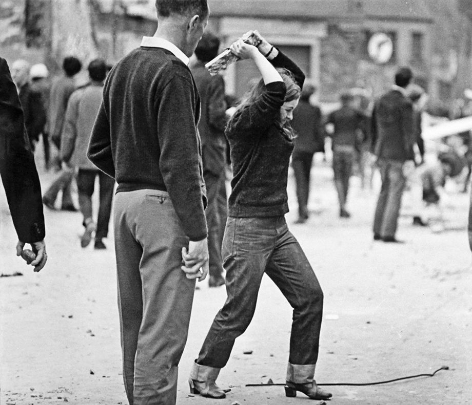A famous photo from the Battle Of The Bogside (included below) shows Bernadette Devlin breaking a piece of pavement. The board above – possibly of two independent halves – has her bringing down the pavement on the issues faced by women in Derry, such as water rates, lone parents, breast cancer support, and smoking cessation.