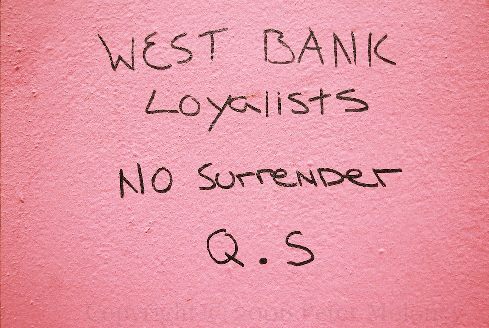 The redevelopment of Stanley’s Walk and Dove Gardens provides a new place for the pyre, under the flag of Palestine. The Ulster Banners, and Israeli and YCV flags will not be so honoured. In the distant background (on the left) is a Brıogáıd Dhoıre board.