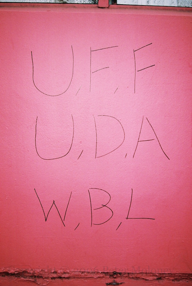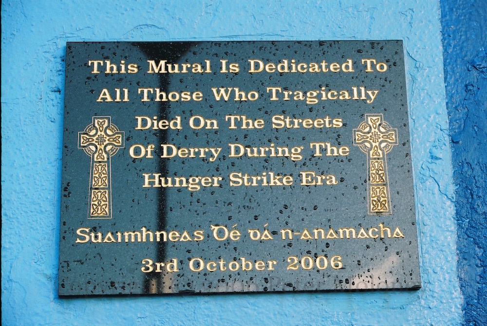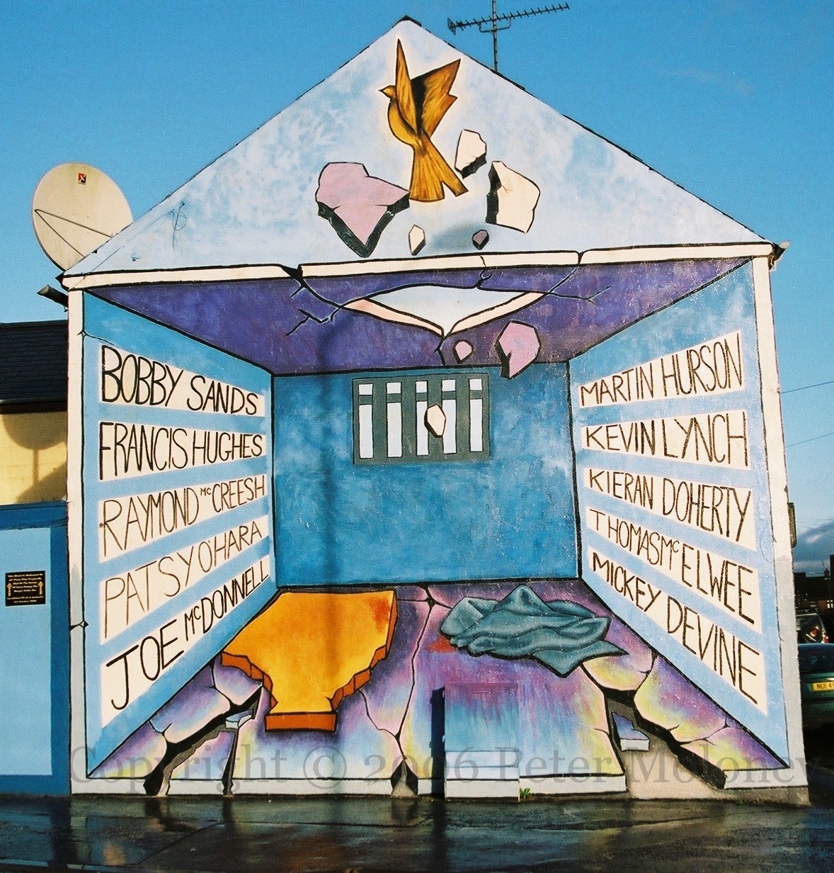 A lark (rather than a dove) bursts through the ceiling of a H-Block cell lined with the names of the ten deceased 1981 hunger strikers. “This mural is dedicated to all those who tragically died on the streets of Derry during the hunger strike era. Suımhneas Dé dá nanamacha. 3rd October 2006.”