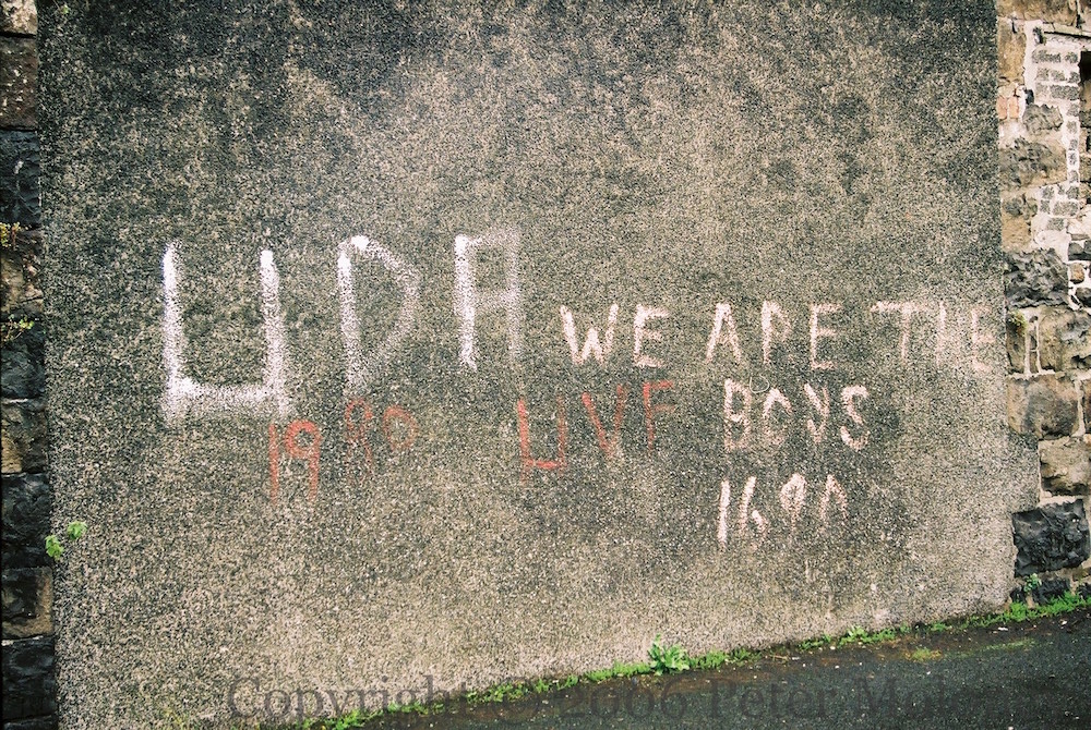 We Are The Boys 2006-08-172025-03-05Extramural Activity UDA and Orange Order graffiti (“1690” and the ladder and star) in Bushmills. Click image to enlargeCopyright © 2006 Peter MoloneyM02814 M02813 Share this: Click to share on X (Opens in new window) X Click to share on Facebook (Opens in new window) Facebook Like Loading... Related