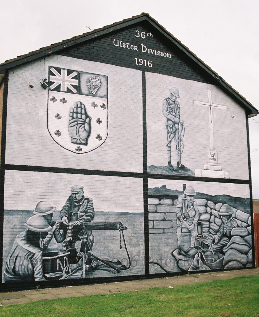 This is a Monkstown WWI mural in four quadrants, showing the emblem of the 36th (Ulster) Division, a soldier at the cross in the Thiepval Cemetery, soldiers feeding a belt of ammunition into a Vicker’s machine gun, and others loading a Stokes mortar.