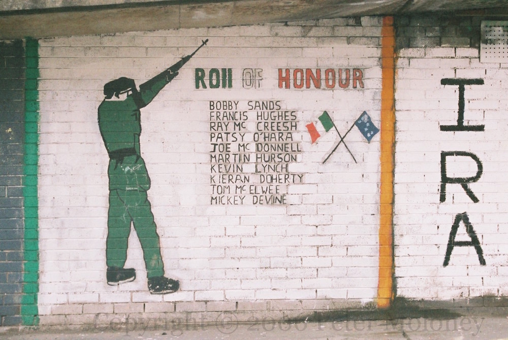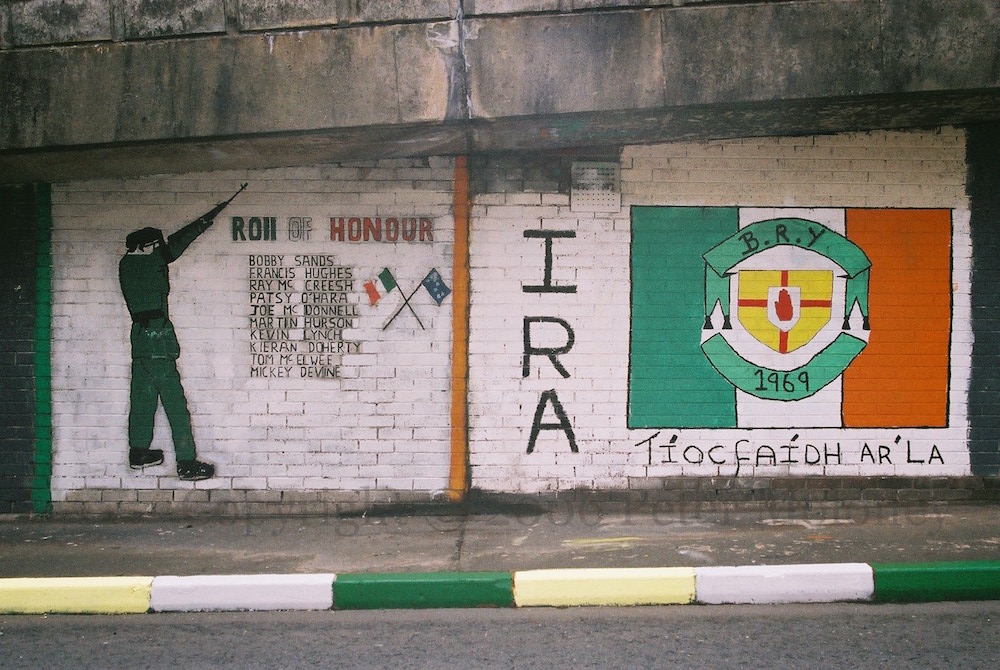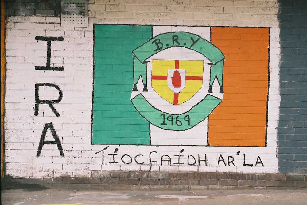 The Roll Of Honour (to the hunger strikers) we have seen before, in 2003 and 2004. New is the BRY (Bogside Republican Youth) mural to the right, claiming to date back to 1969, with the shield of Ulster on a Tricolour and fadas randomly distributed over “tıocfaıdh ár lá”.
