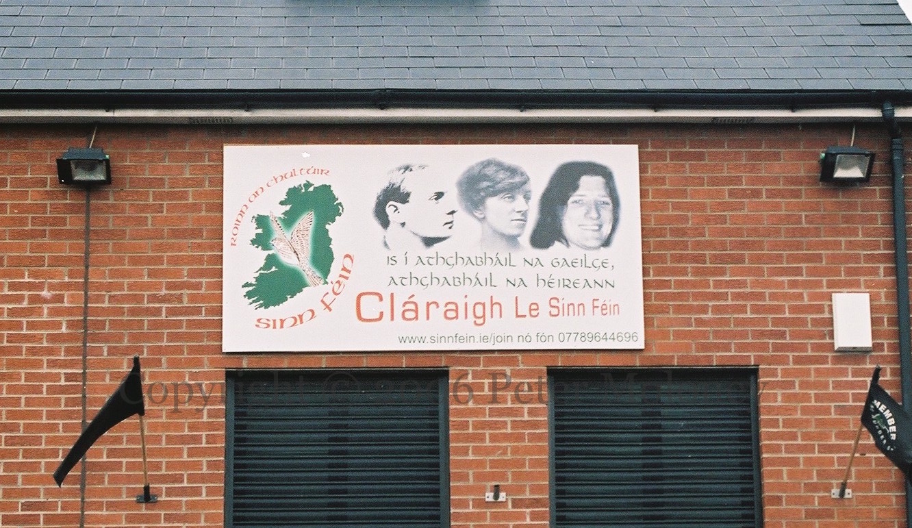 These two “Join Sınn Féın” boards are above the Sınn Féın office on the Falls Road, Belfast. “Don’t wish for a united Ireland, work for it.”The second, with portraits of Pearse, Carney, and Sands, is an example of the Irish-language rights campaign which becomes a central policy around this time: Is í athgabháıl na Gaeılge athgabháıl na hÉıreann [the repossession of Irish is the repossession of Ireland]. (See previously Cearta Teanga, Cearta Daonna.)