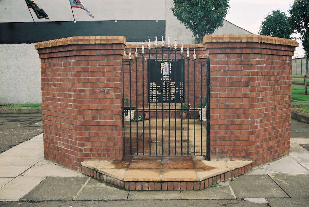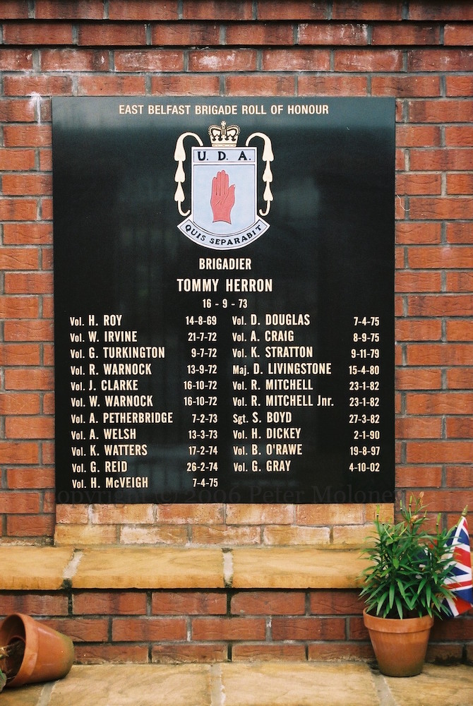 Tommy Herron, brigadier in East Belfast, heads the list of UDA volunteers on this Dee Street stone. Herron was kidnapped and killed in September 1973, perhaps by the UDA itself for Herron’s extortion and racketeering (Irish Times).