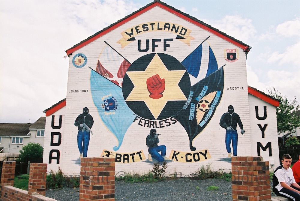The crest in the top left is of the “Cavehill Young Loyalists” who wrote on their website “The Cavehill Young Loyalists was formed on June 1999 in Westland, North Belfast by a group of young Protestants not willing to tolerate any more violence from the Irish Republican Movement, so they took up arms. Innocent Catholic families should have no fear of us as we attack legitimate Republican targets, but make no mistake we are in readiness, and fearless.” (archive.org). “Westland UFF 3rd batt K coy.”