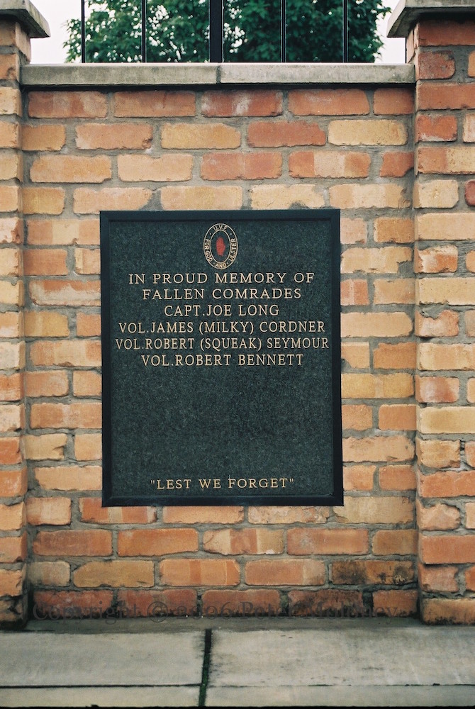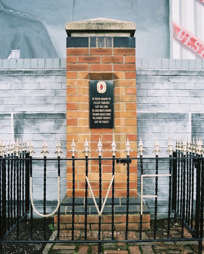 The four others, listed both on the plaque in front of the mural and on the stone in the memorial garden (constructed in 2003) are UVF volunteers Robert Seymour, shot dead by the PIRA; James Cordner and Joseph Long, who were killed in a premature explosion, and Robert Bennett, killed by the British Army during a riot. (Seymour and Long are on the right of the mural.)